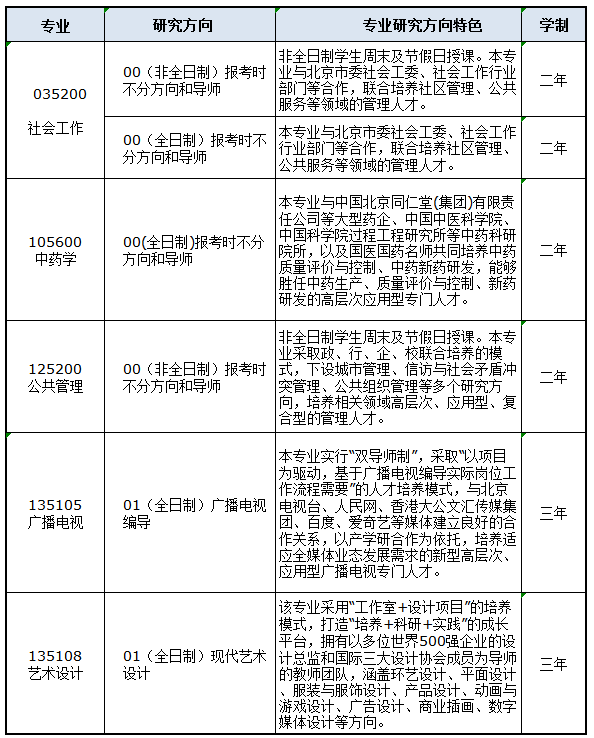 3.學制:社會工作碩士、中藥學碩士、公共管理碩士學制為二年,藝術碩士的電影、美術、廣播電視、藝術設計等各領域學制為三年,全日制和非全日制學生學制相同。