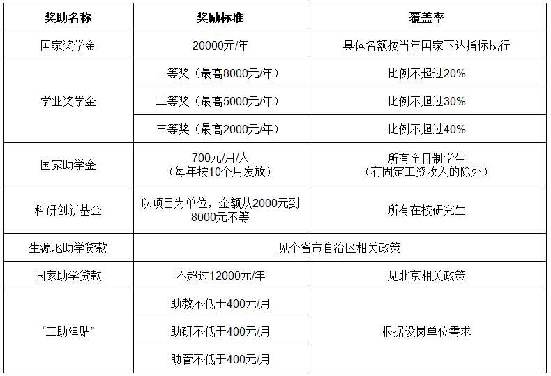 根據北京市財政局、北京市教育委員會制定的《北京市研究生國家獎學金、學業獎學金、國家助學金管理暫行辦法》,我校研究生設置有國家獎學金、學業獎學金和助學金,國家獎學金和學業獎學金按照獎學金評選辦法進行評選,助學金面向非定向學生。同時,學校設置研究生“三助”崗位,為研究生提供勤工助學機會。