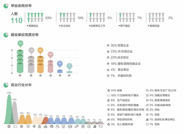 畢業生就業單位以民營企業、外/合資企業、自主創業為主,互聯網、金融行業是主要的就業行業。