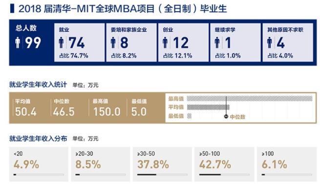清華大學MIT全球MBA項目的畢業生平均年收入為50.4萬,就業行業以投資管理、互聯網、電信等為主,就業職能以金融、咨詢為主。