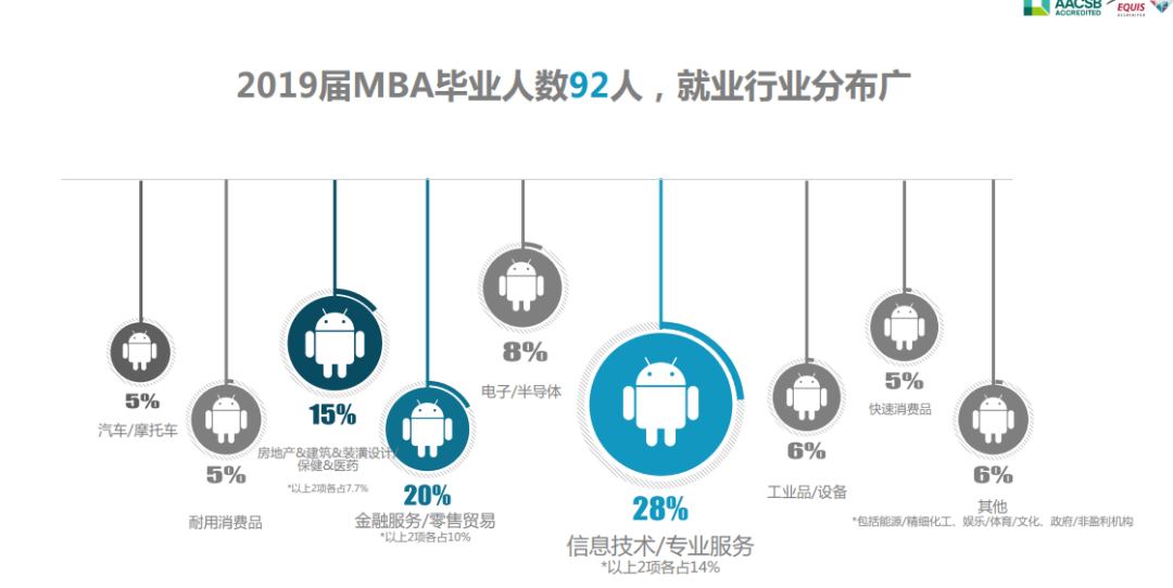 從上圖就業數據可知,私募股權與風險投資依舊是 MBA 同學就業的主要方向,傳統金融機構基金、 證券、信托、資管持續作為同學們的首要選擇,伴隨著信息技術的迭代發展, 金融科技新興業態的就業崗位機會也將被越來越多的同學們所關注。