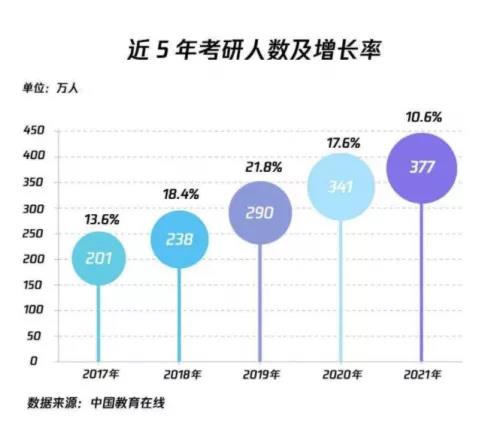 近年來,考研形式越發嚴酷,2021年考研報名人數繼續上漲,達到377萬,較2020年的341萬增加36萬,增幅為10.6%,報考人數再創歷史新高。自2017年研究生報考人數首次突破200萬人大關,達到201萬后,考研人數逐年上漲,五年翻了近一番,考研的壓力和難度可想而知。