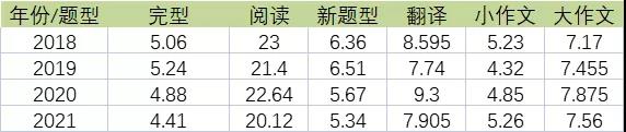 2021年數據樣本英語一和英語二分別抽選了130多萬考生,2021考研英語全國平均分如下: 2021考研英語二抽取了1350118名考生的試卷做了統計分析,統計結果如下: 上表為英語二真題的平均分和難度。2021年的英語真題平均分為50.58分,難度系數為0.506,為近三年最低。 考研英語二各題型平均分對比 注:英語二翻譯15分,小作文10分,大作文15分 上表為換算后的英語二歷年真題各題型的平均分。 21考研英語二“完形“平均分4.41分,和前兩年相比都明顯更難。 “閱讀”A節平均分20.12分,B節“新題型”平均分5.34分,比前兩年都略難。C節“翻譯”平均分7.905分,難度與19年持平,比20考研明顯更難。 寫作部分整體穩定。A節”小作文“平均分5.26分,比前兩年都要更容易。B節“大作文”平均分7.56分,比19年和18年更簡單,但比20年更難。 總體特征 1.選材覆蓋面廣,時代性鮮明 試卷所選文章內容涉及健康﹑商業、環保、文化、法律、科技﹑教育等諸多領域。在關注語言和篇章結構復雜性的同時,注重內容的思想性、知識性和趣味性。文章內容具有普遍性,沒有專業性強的篇章。所選文章多來自較新的英文原版資料,能很好地反映當代英語語言特點,內容具有鮮明的時代性。 2.考查目標明確,聚焦英語綜合運用能力 試題考查目標明確,以英語綜合運用能力為重點。英語知識運用部分兼顧語言知識和閱讀能力的考查,要求考生運用語言知識并結合文章理解作答。閱讀理解部分全面考查各項閱讀微技能,深人考查綜合理解語篇的能力。寫作部分主旨明確、立意深刻,對英語綜合運用能力提出了較高的要求。 3.試題難度合理,質量穩定 試卷結構及題型與往年保持一致,考點分布均衡。試卷總體難度基本合理,過難、過易的試題極少。閱讀材料難度適中,寫作試題難度與往年持平。