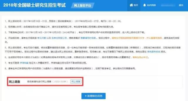 完成網(wǎng)上調(diào)查后,回到步驟2.2,點擊“新增報名信息”進行報名。請考生務(wù)必仔細閱讀以上頁面通知!