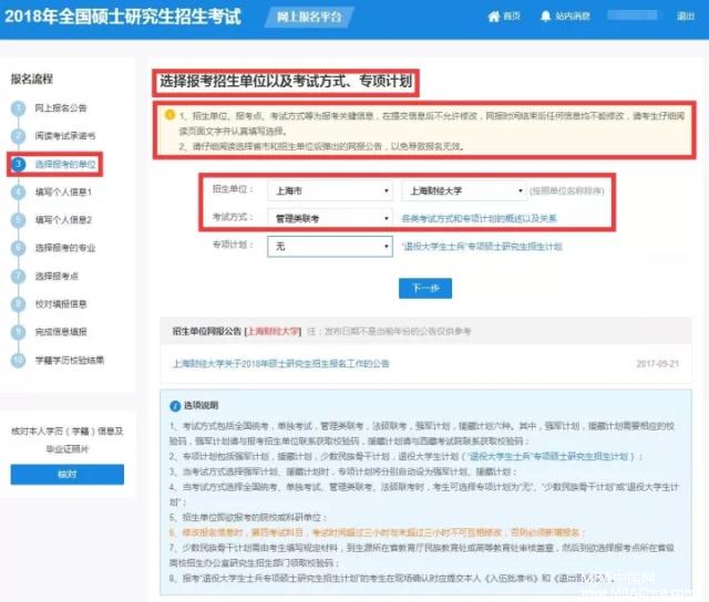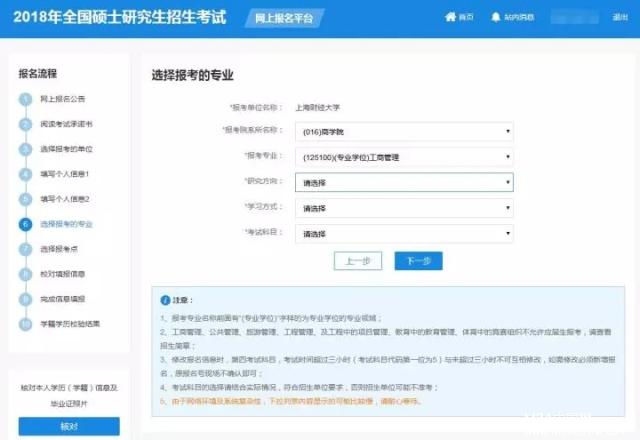 ● “研究方向”為(01)工商管理(全球);(02)工商管理;(03)工商管理(金融投資)和(04)高級管理人員工商管理碩士。其中01-03為MBA項目班級,04為EMBA項目,各項目班級特色詳見《上海財經(jīng)大學2018年入學MBA(EMBA)招生簡章》;選擇01的考生在“學習方式”中選擇“(1)全日制”,選擇02-04的考生在學習方式中選擇“(2)非全日制”。