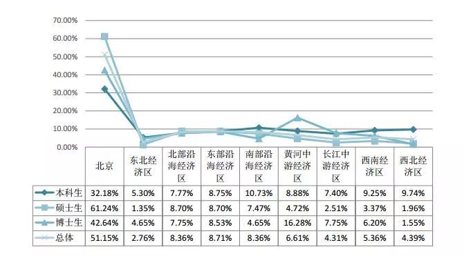 具體從學歷層次來看,32.18%的本科生選擇在北京就業,其次選擇在東部地區(29.72%)。61.24%的碩士生選擇在北京就業,其次選擇在東部地區(25.41%)。42.64%的博士生選擇在北京就業,其次選擇在東部地區(23.26%)。