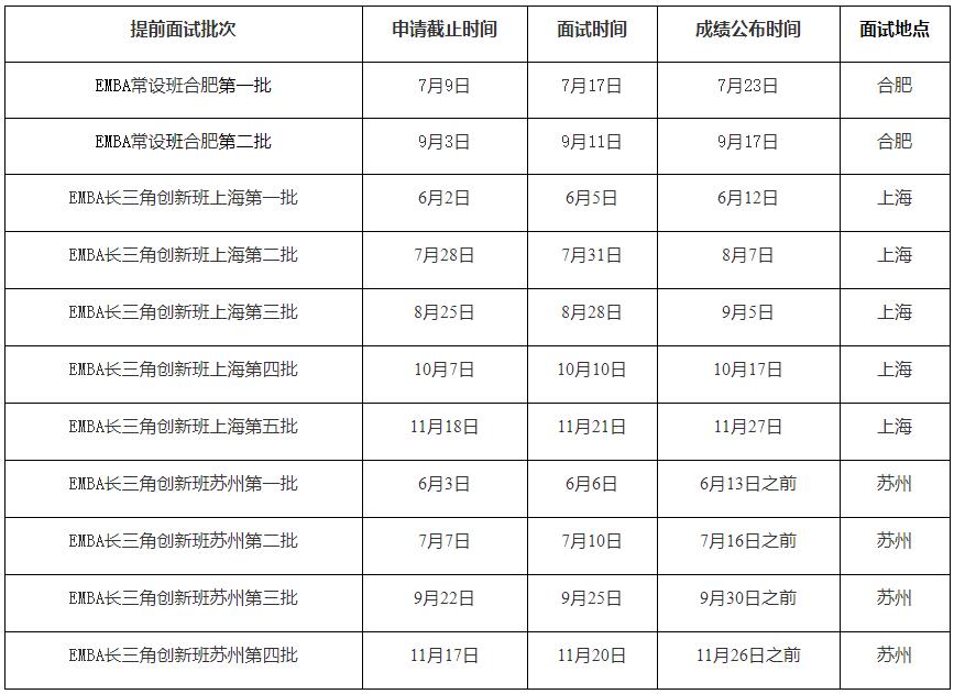 復試批次安排:非全日制EMBA常設班考生可申請參加提前批面試也可參加正常批面試,非全日制EMBA長三角創新班考生實行全面提前面試(提前面試項目須與報考項目及研究方向一致,不一致提前面試成績無效。同一報考項目及研究方向須且只能參加一次面試)。提前面試成績優秀獲國家線條件錄取資格;提前面試成績合格以上且初試成績達EMBA項目復試分數線其提前面試成績計入錄取成績進行該項目排序錄取。