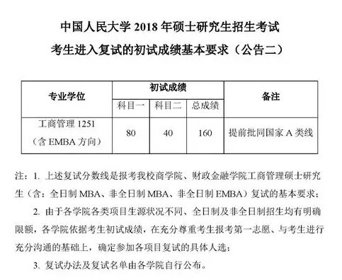 中國人民大學2018MBA分數線已發布,總分為160,英語為40,綜合為80.