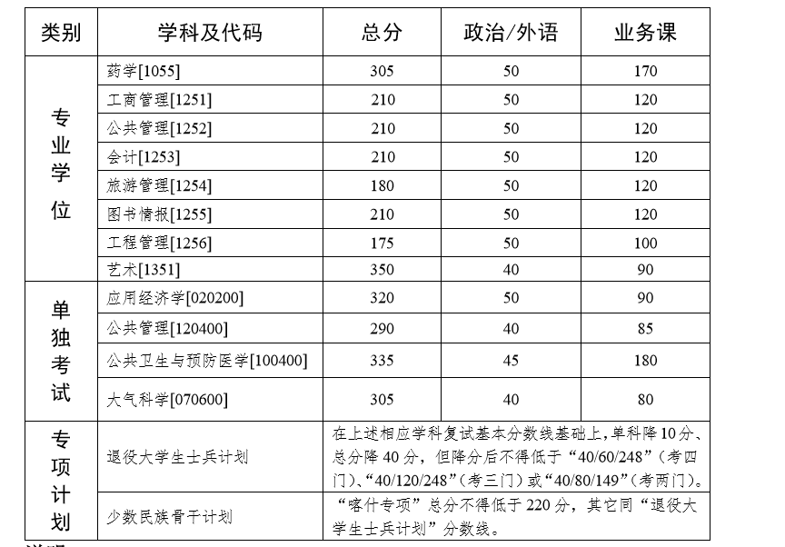 3. 工商管理[1251]、公共管理[1252]、會計[1253]、旅游管理[1254]、 圖書情報[1255]等五個專業(yè)通過提前面試的考生,適用國家 A 類線 (175/44/88)。復試及錄取要求參見相關招生單位規(guī)定。