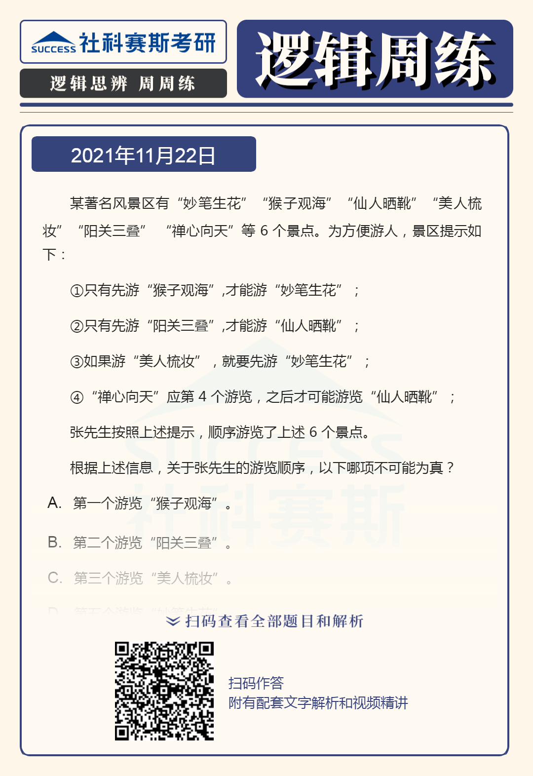 以上就是“2022MBA邏輯:2022MBA聯考邏輯習題及答案解析(11月22日)”的全部內容,更多邏輯精選習題,請持續關注社科賽斯MBA備考網!