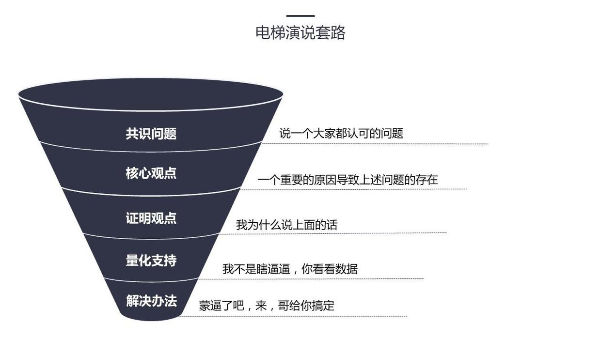 這個(gè)套路的本意就是:即使與別人在電梯間的短暫相遇,你也能清楚準(zhǔn)確的表達(dá)觀點(diǎn)。