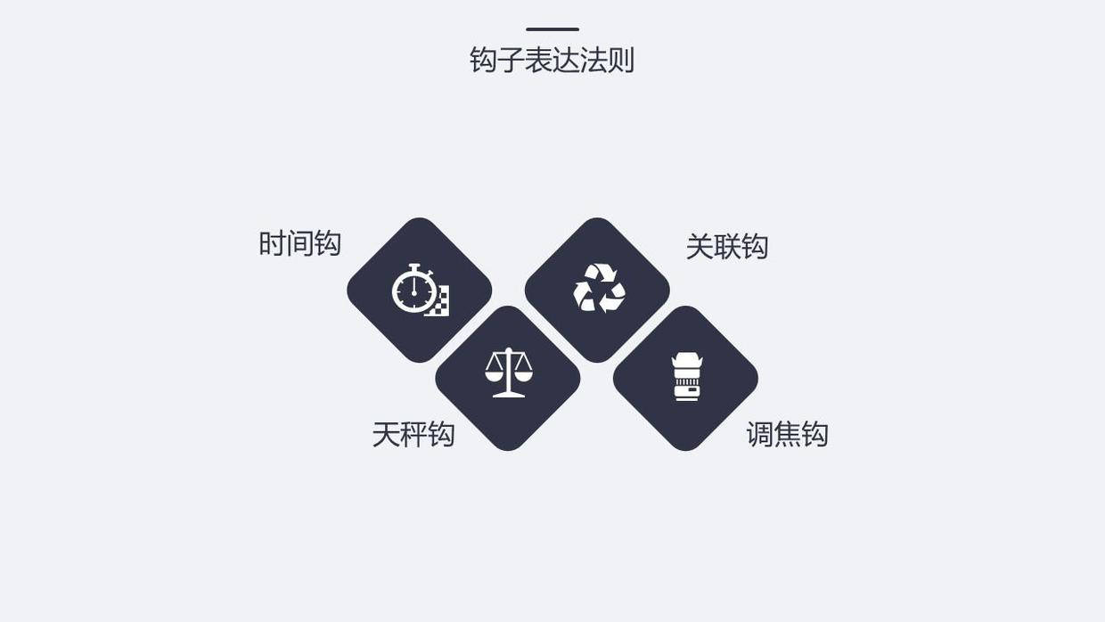常見的鉤子有“過去、現(xiàn)在、未來”、“去年、今年、明年”、“短期、中期、長(zhǎng)期”