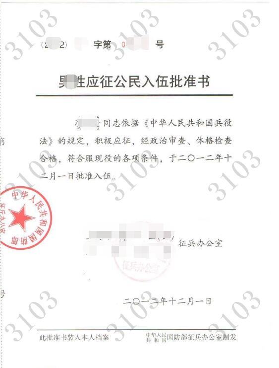 國防部征兵辦蓋章的本人《入伍批準書》和《退出現役證》 |