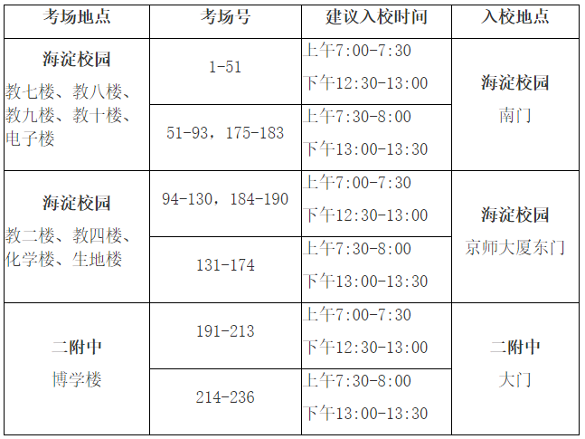 (1)12月26日-27日上午7:00開始,下午12:30開始,在海淀校園考試的考生在校園南門、京師大廈東門進(jìn)行防疫檢測,檢測合格后方能進(jìn)入校園考試(注意:校園其他校門不設(shè)防疫檢測點,考生無法通行);二附中考生由二附中大門進(jìn)入校園,進(jìn)行防疫檢測。