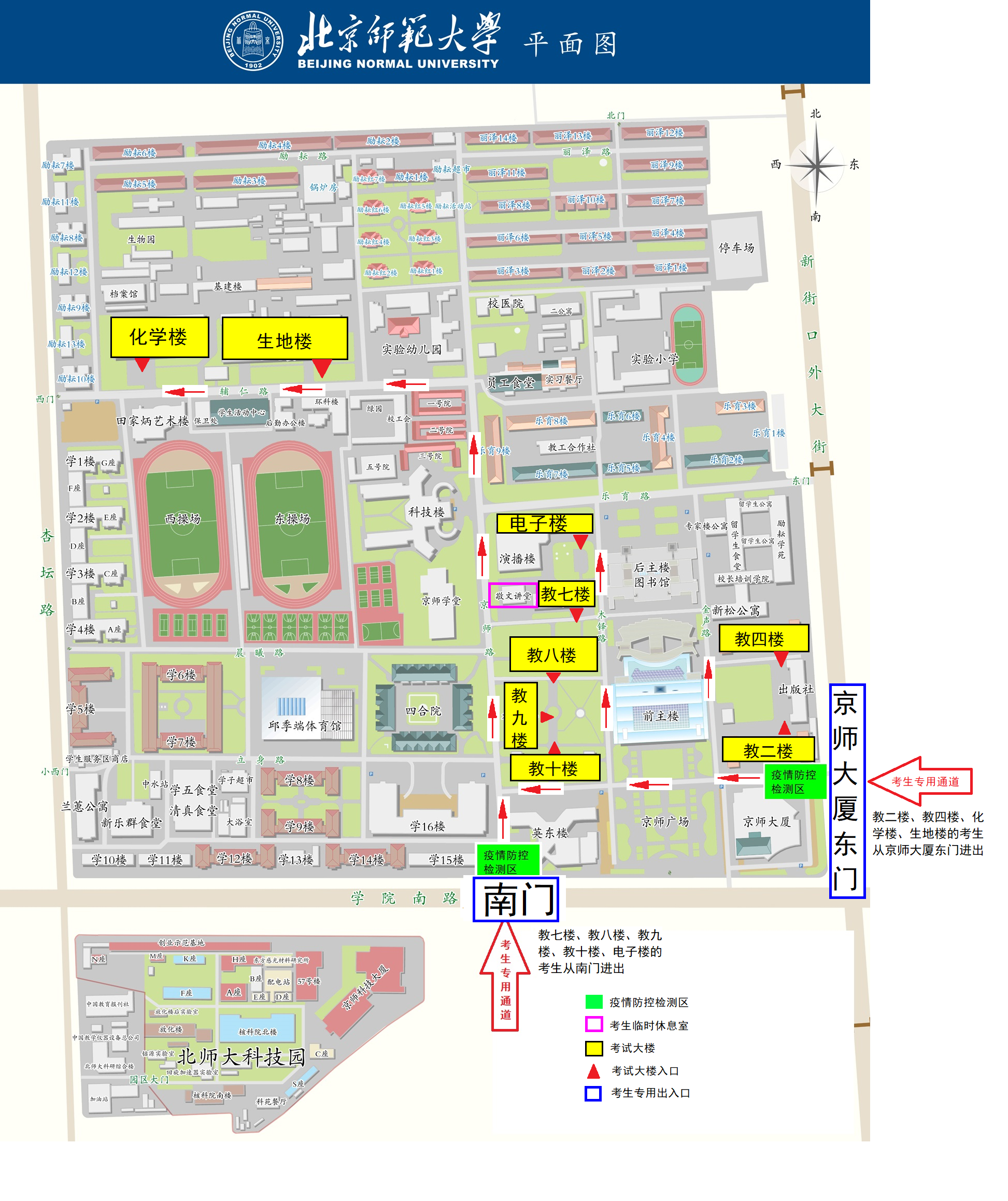 (3)體溫檢測,準(zhǔn)考證、身份證查驗,核酸檢測陰性報告驗證,綠色健康碼核查環(huán)節(jié)將需要一定時間,請考生務(wù)必預(yù)留充足時間提前到達(dá)考點,有序排隊,并聽從現(xiàn)場工作人員引導(dǎo)與指揮。海淀校園南門、京師大廈東門至最遠(yuǎn)考試樓步行時間約為15分鐘。