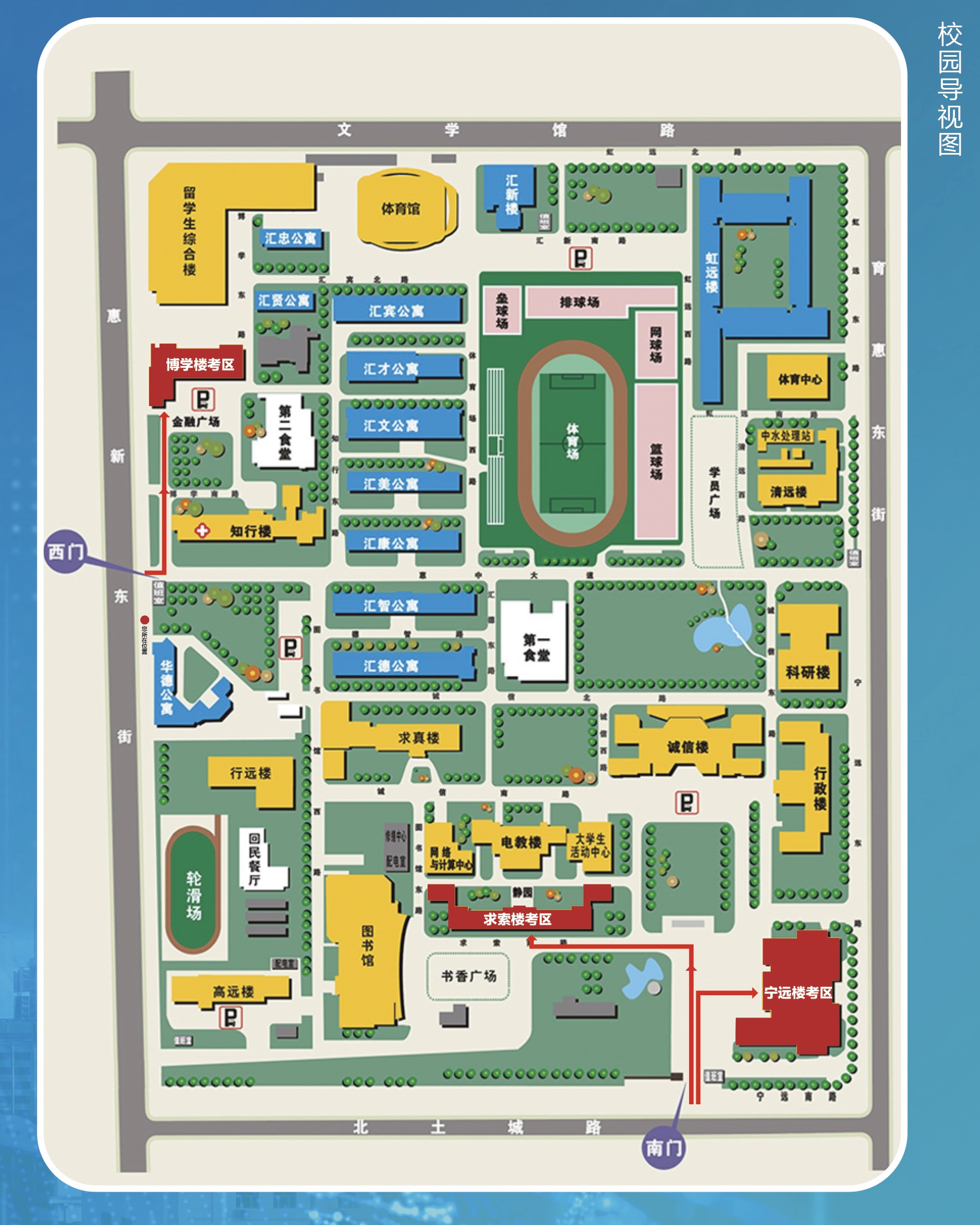 考生進入校園后,請按路線圖和指示標志直接前往所在考區考場,不要在其他區域活動或逗留,以免錯過入場時間。
