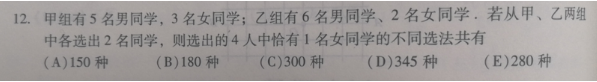 7.甲乙兩組同學中,甲組有3男3女,乙組有4男2女,從甲、乙兩組中各選出兩名同學,這4人中恰有1女的選法有