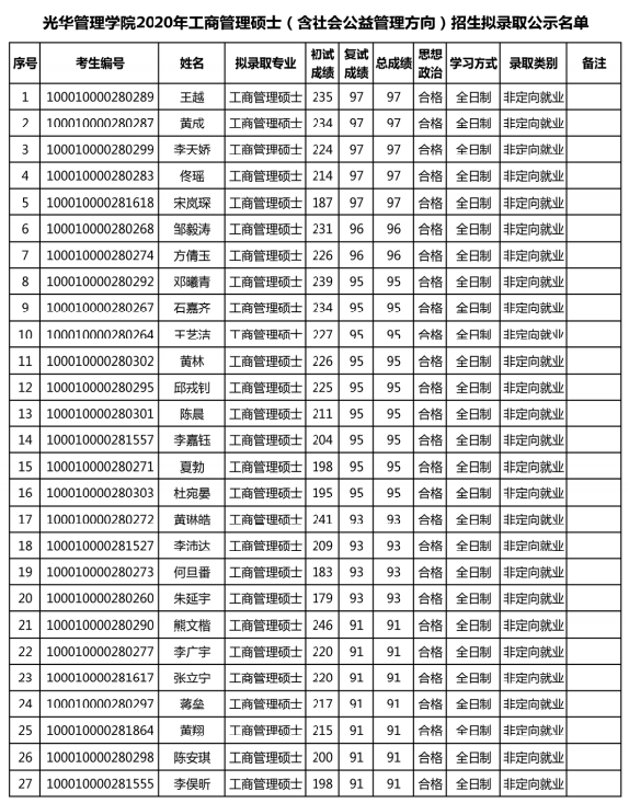 近日,全國各大研究生院校已公布2020研究生擬錄取名單。2020年研究生擬錄取名單不僅對于2020考研的同學(xué)很重要,對于2021考研的同學(xué)也很重要。2021考研的小伙伴可以通過2020年擬錄取名單分析今年的考情,從而做出最適合自己的考研決策。今天小編就整理了“2020MBA擬錄取名單:北京大學(xué)工商管理碩士招生擬錄取名單匯總”的相關(guān)內(nèi)容,希望能對大家有所幫助。