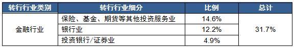 2016年中央財經(jīng)大學的MBA就業(yè)報告里,由非金融行業(yè)轉換到金融行業(yè)的比率高達31.7%;金融行業(yè)之間的轉換比率為17.1%;其中非金融行業(yè)轉換到金融行業(yè)的具體細分情況如下: