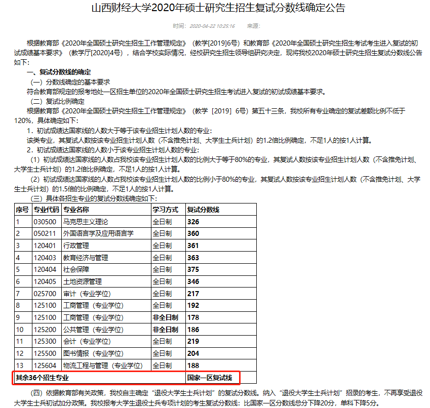 山西財經大學2020年MEM(項目管理)復試基本分數線:175/88/44
