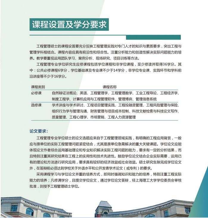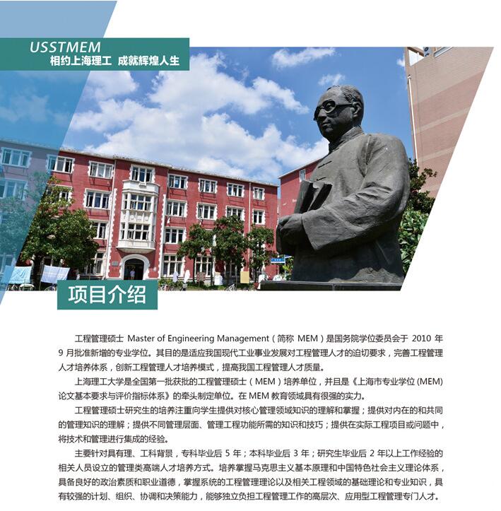 導讀:上海理工大學MEM項目特色:發揮上海理工大學多學科交叉優勢,強調基本功,重視品德修行、追求解決工程管理中的復雜問題的能力。上海理工大學的工程管理的課程設置要充分反映工程管理實踐對專門人才的知識與素質要求,突出工程與管理學科相結合