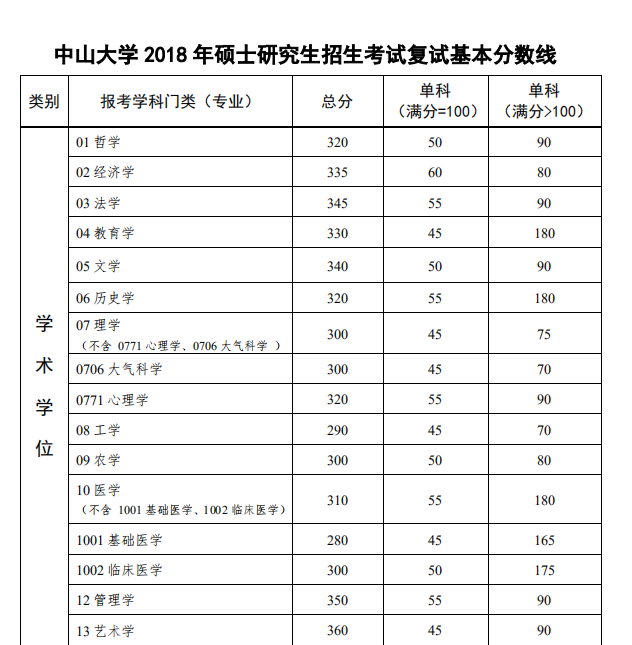 | 類別 | 報考學科門類(專業) | 總分 | 單科 (滿分=100) | 單科 (滿分>100) |