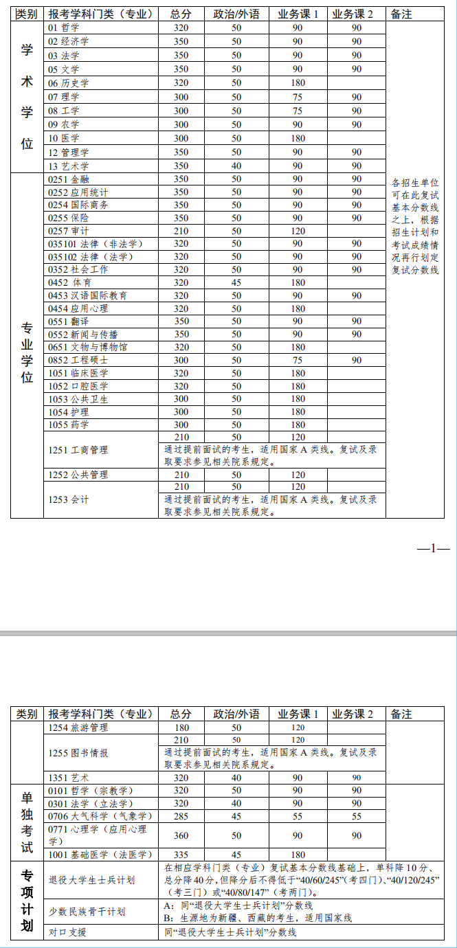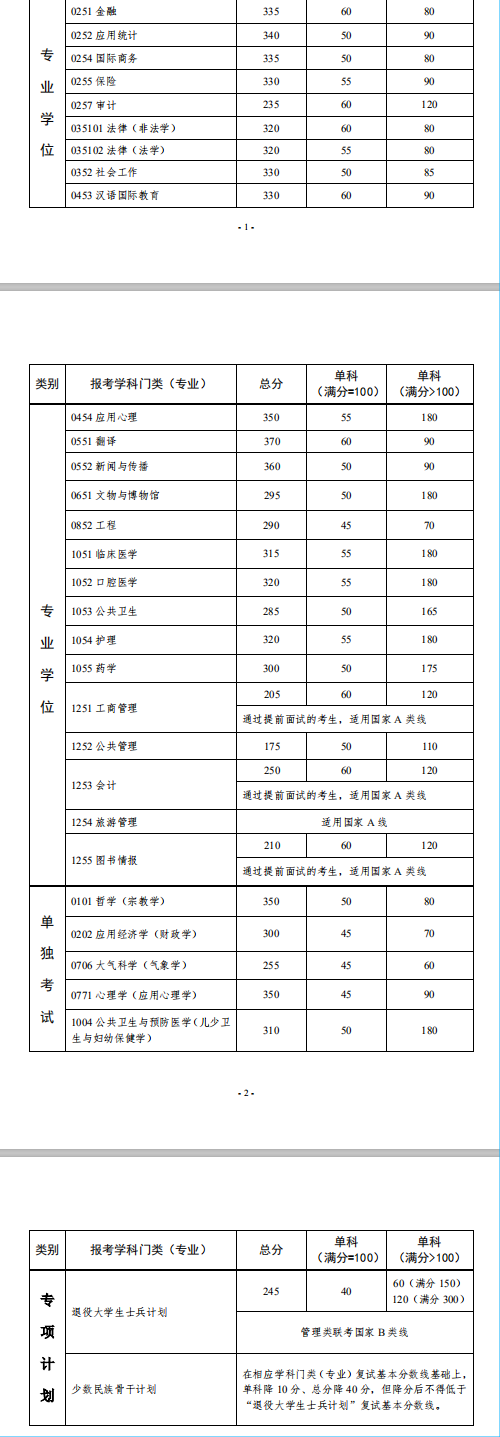 | 少數民族骨干計劃 | 在相應學科門類(專業)復試基本分數線基礎上,單科降10分、總分降40分(不得低于國家線)。 | |||
