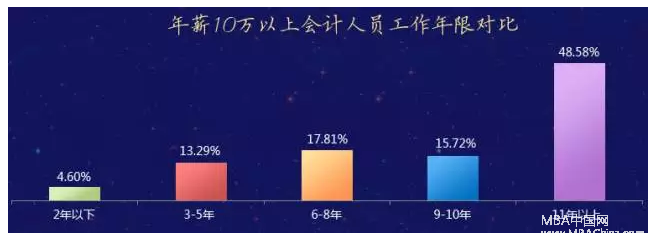 總體上看,會計行業是一個“厚積薄發”的行業,隨著工作年限的增長,對會計工作了解的更加深入,經驗更加豐富,因此想獲得相對比較好的薪水需要在這個行業不斷沉淀自己,從上圖可以看出,薪水超過10萬的會計人當中,工作年限3年以上的人數占比高達95%,會計工作很穩定,值得大家托付一輩子。