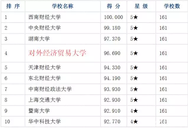 會計專業碩士榜涵蓋全國各地會計碩士學科(專碩)高校161所,共評有8所五星大學, 對外經濟貿易大學會計碩士學科(專碩)位列全國第四。
