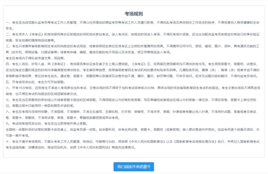 點擊“我已閱讀并承諾遵守”按鈕后,進入省級教育招生考試機構公告頁面。