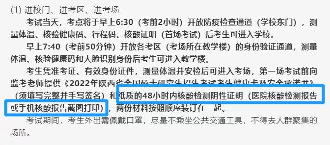 山東省教育招生考試辦發布的22考研考生須知中明確了“所有考生進入考點時均須持有考前48小時內核酸檢測陰性紙質報告和《健康管理信息采集表》(首場交)”。