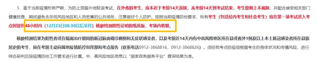 所有考生(包括校內考生和社會考生)應在第一場考試進入考點時提供48小時內(12月23日08:30以后采樣)核酸檢測陰性證明的紙質版,考場內收取。