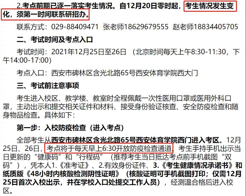 12月25日、26日,考點將于每天早上6:30開放防疫檢查通道。考生手持手機出示當日更新的“健康碼”和“行程碼”(推薦考生當日抵達考點前手機截圖“雙碼”),憑本人1.《準考證》、2.有效身份證件、3.《考生健康情況承諾書》和紙質版《48小時內核酸檢測陰性證明》(僅需12月25日首次入校出示,并在學校入口處提交工作人員),經測溫合格后進入校區。