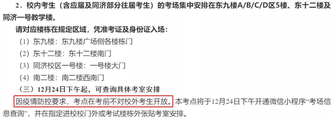 本考點將于12月24日下午開通微信小程序“考場信息查詢”,并在指定進校校門外或考試樓棟外張貼考室安排。