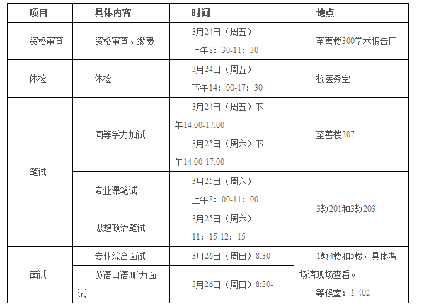 ⑥同等學力考生除須參加上述復試內容外,還須參加2門該專業(yè)本科階段主干課程的加試(筆試,成績不計入復試總成績)。加試科目每科試卷滿分為100分,考試時間為3小時。