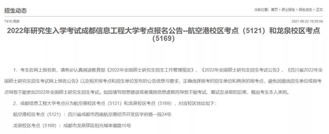成都信息工程大學(xué)考點(diǎn)分為航空港校區(qū)考點(diǎn)(5121)和龍泉校區(qū)考點(diǎn)(5169),對(duì)應(yīng)校區(qū)地址如下: