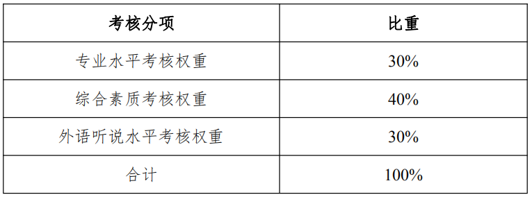 復試成績=專業水平考核成績×專業水平考核權重+綜合素質考核成績×綜合素質考核成績權重+外語聽說水平考核成績×外語聽說水平考核權重