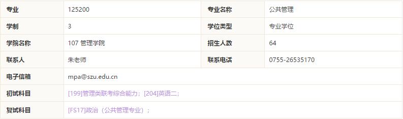 2010年,經(jīng)國(guó)務(wù)院學(xué)位委員會(huì)批準(zhǔn),深圳大學(xué)獲準(zhǔn)為公共管理碩士(MPA)專業(yè)學(xué)位研究生培養(yǎng)單位。目前的專業(yè)方向?yàn)楣舱吲c特區(qū)發(fā)展、城市管理與社會(huì)治理兩個(gè)方向,為公共管理人員提供了更新知識(shí)和提升能力的有效途徑。