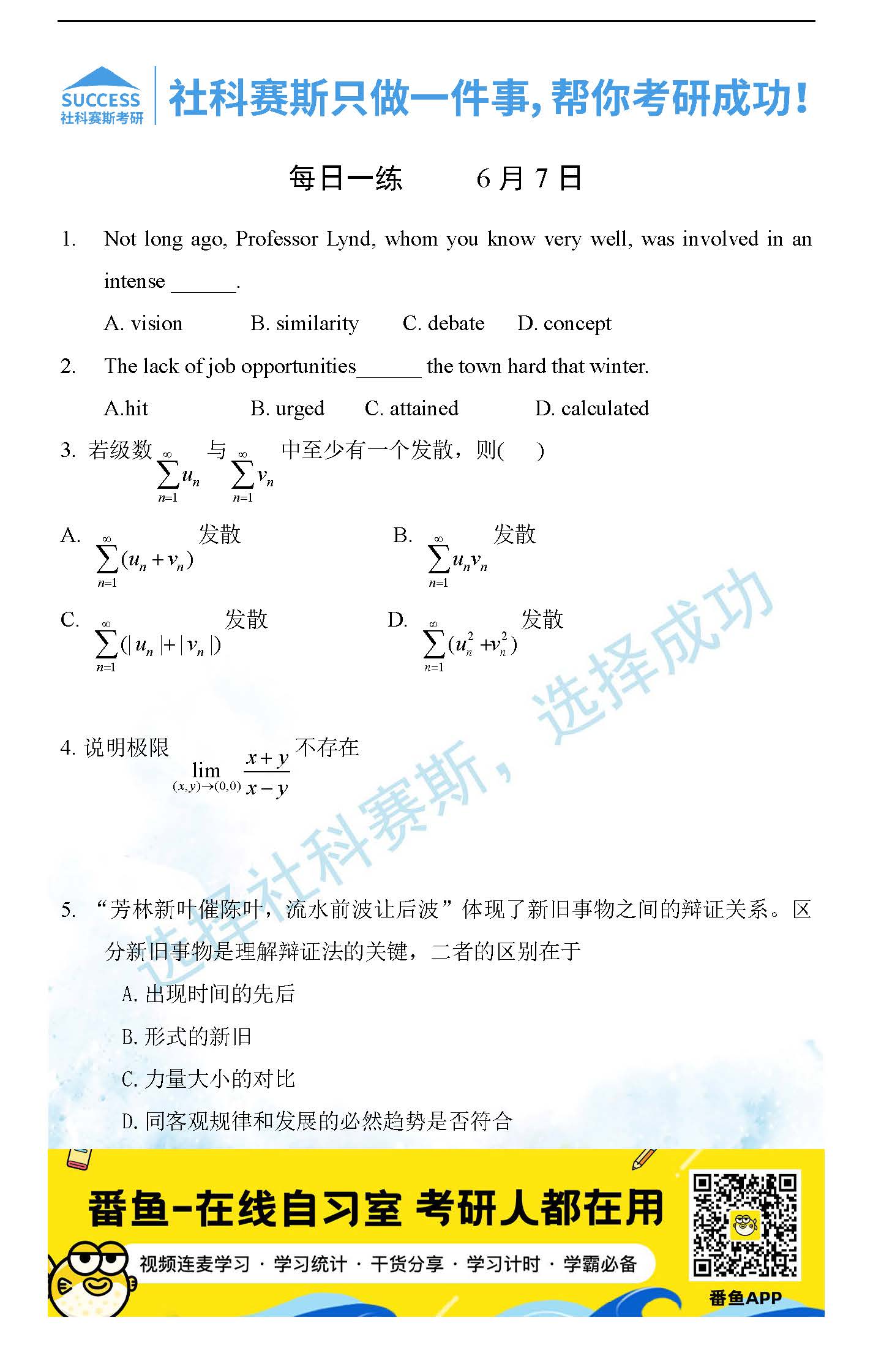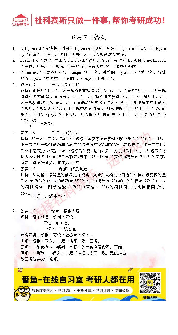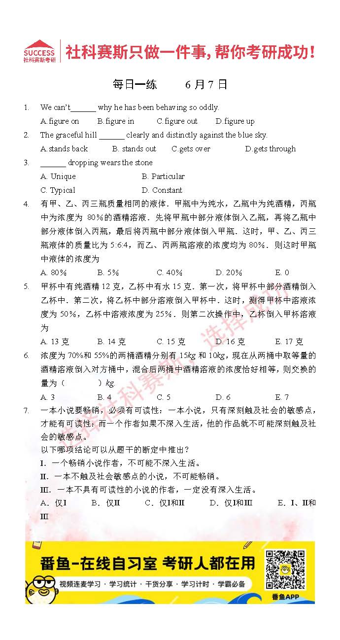 導(dǎo)讀:考研是一場(chǎng)持久戰(zhàn),保持良好的學(xué)習(xí)習(xí)慣,是能確保復(fù)習(xí)高效的關(guān)鍵。今天社科賽斯MBA備考網(wǎng)小編整理了“2022管理類聯(lián)考6月7日每日一練及答案”的內(nèi)容,希望能對(duì)廣大考生有所幫助。