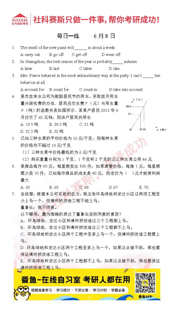 導(dǎo)讀:考研是一場持久戰(zhàn),保持良好的學(xué)習(xí)習(xí)慣,是能確保復(fù)習(xí)高效的關(guān)鍵。今天社科賽斯MBA備考網(wǎng)小編整理了“2022管理類聯(lián)考6月8日每日一練及答案”的內(nèi)容,希望能對廣大考生有所幫助。