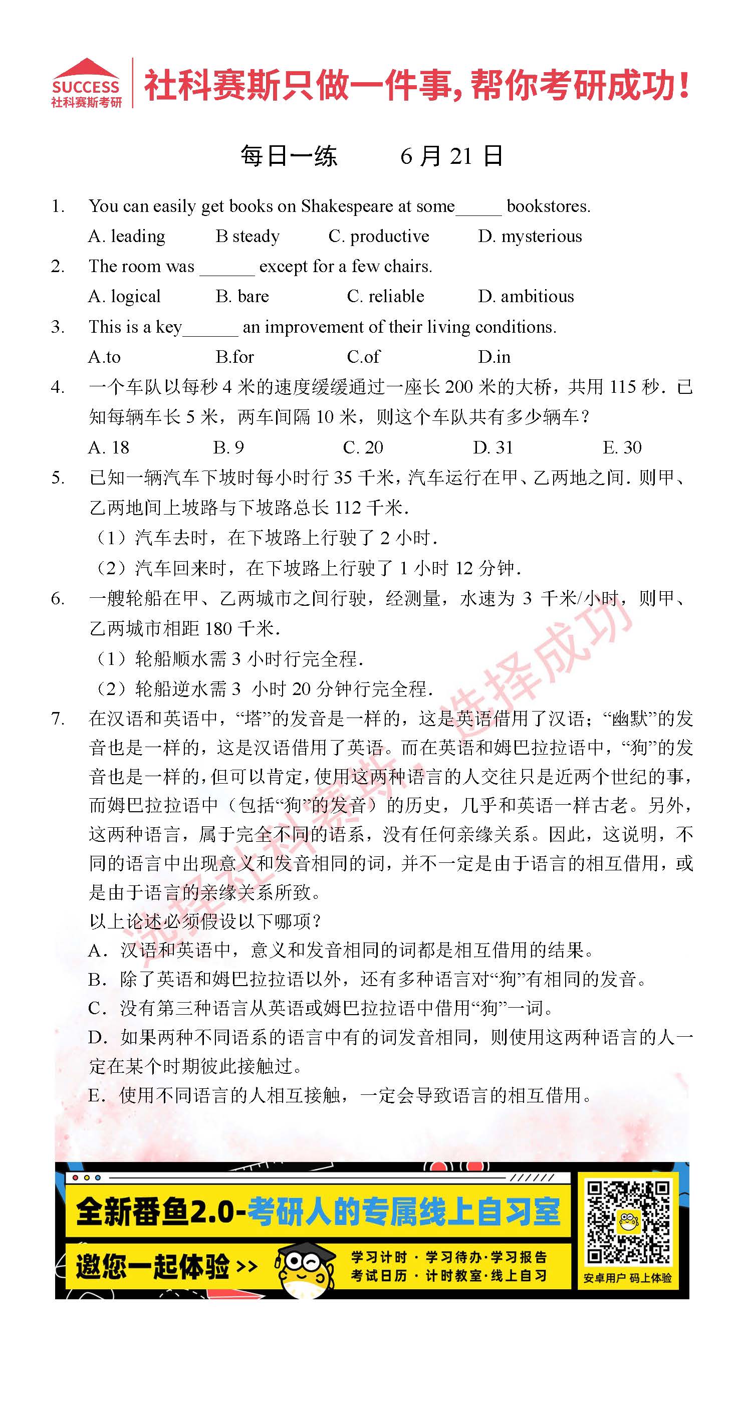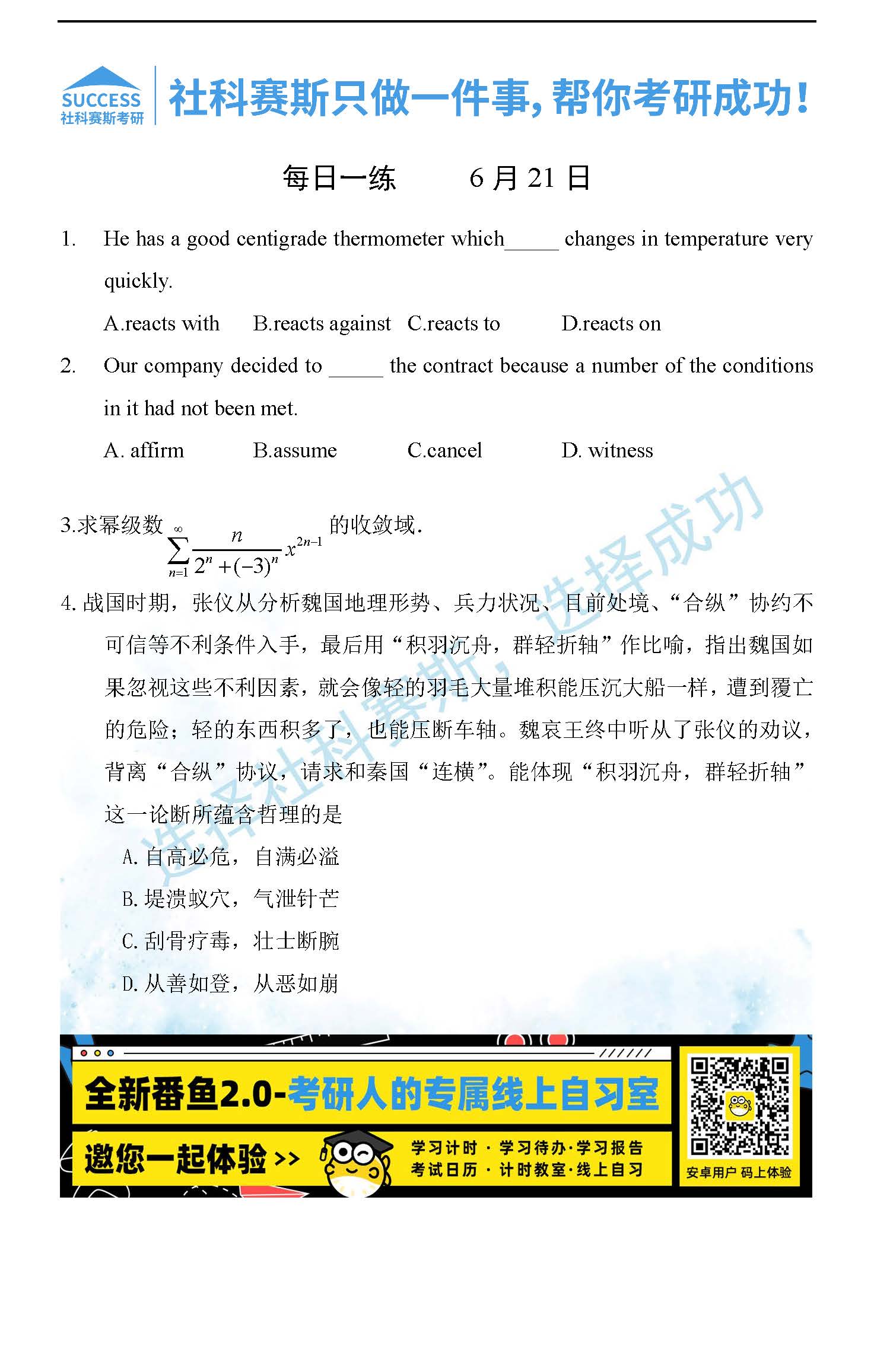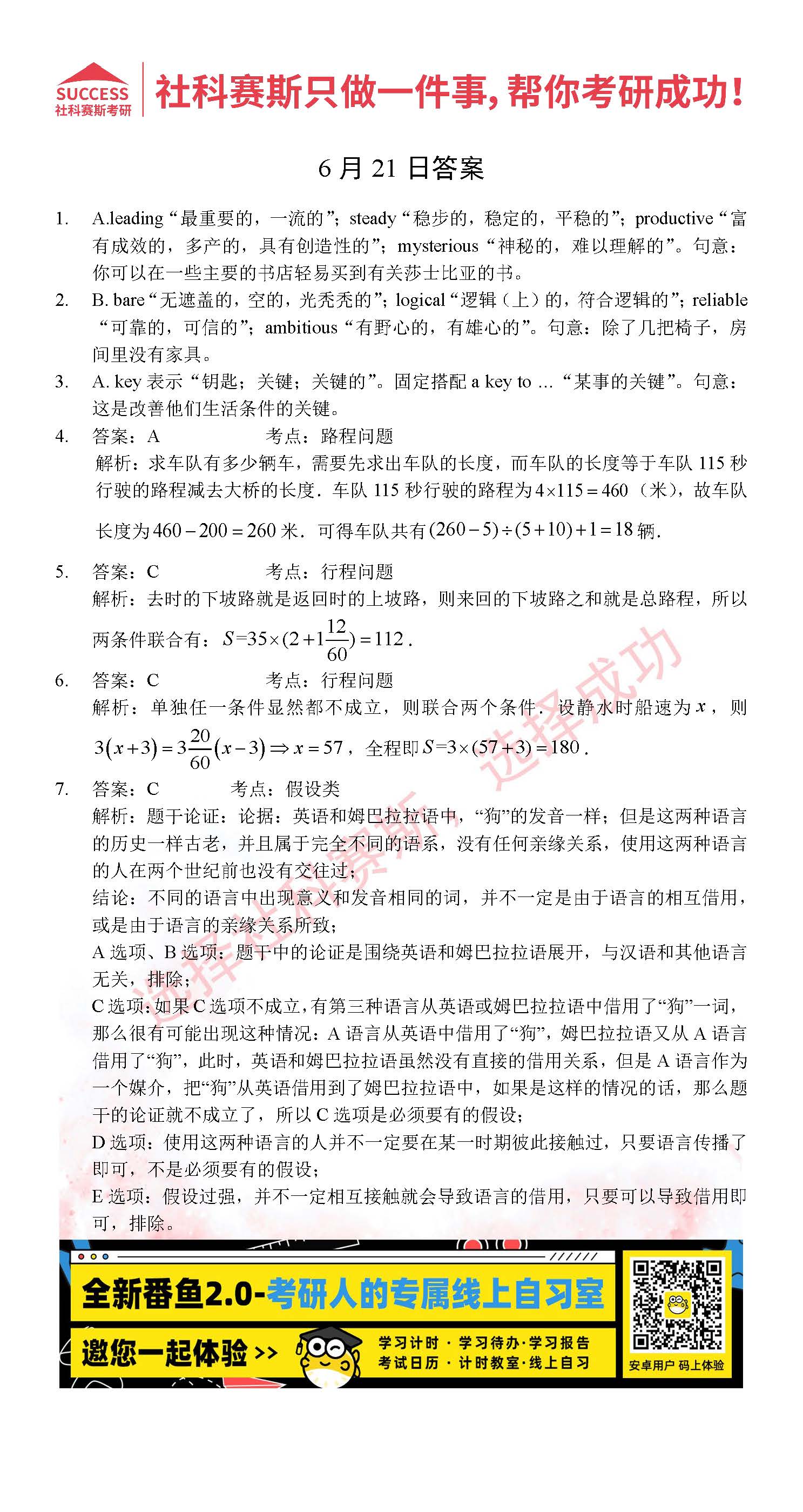 導(dǎo)讀:考研是一場持久戰(zhàn),保持良好的學(xué)習(xí)習(xí)慣,是能確保復(fù)習(xí)高效的關(guān)鍵。今天社科賽斯MBA備考網(wǎng)小編整理了“2022管理類聯(lián)考6月21日每日一練及答案”的內(nèi)容,希望能對廣大考生有所幫助。