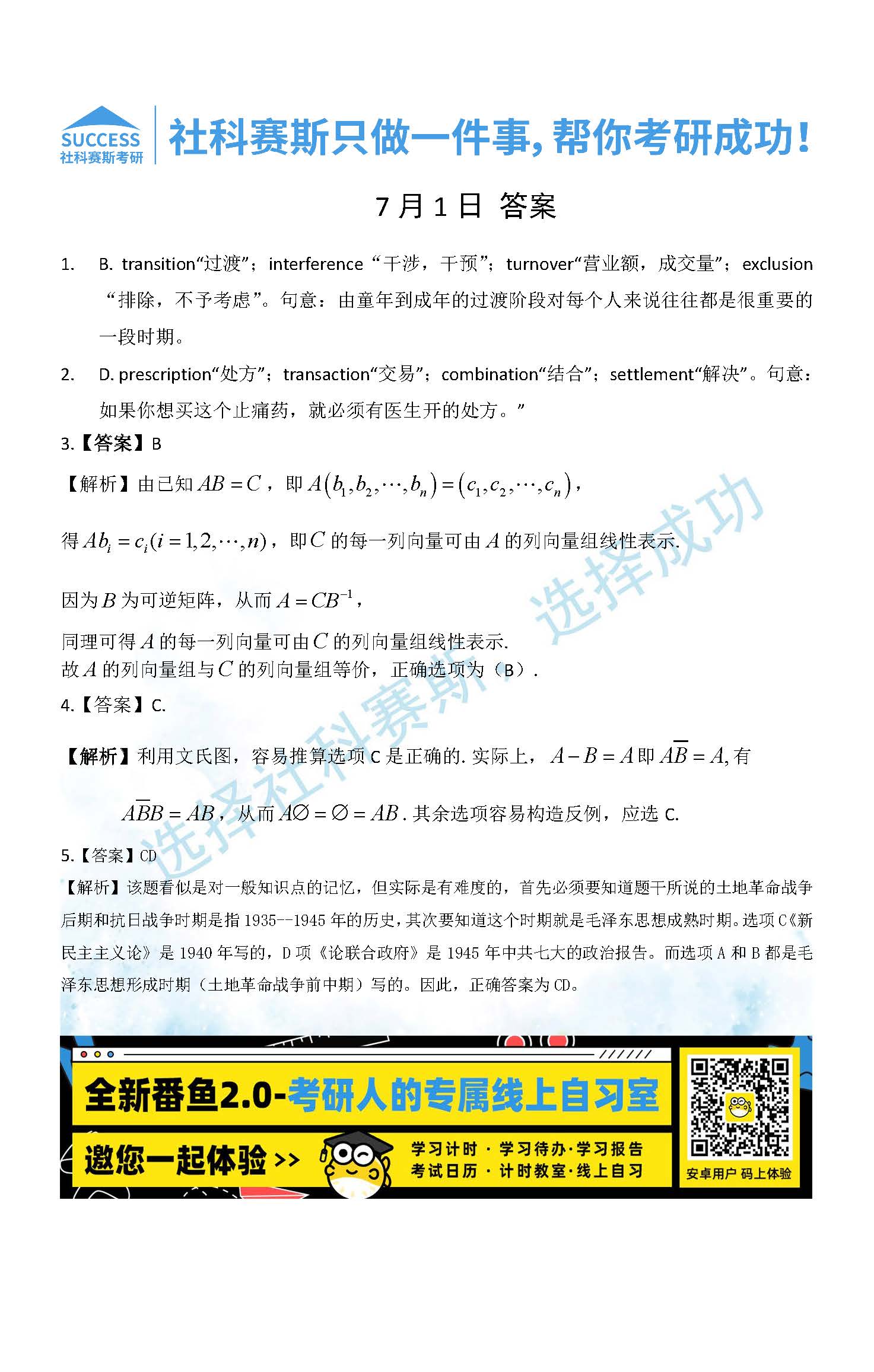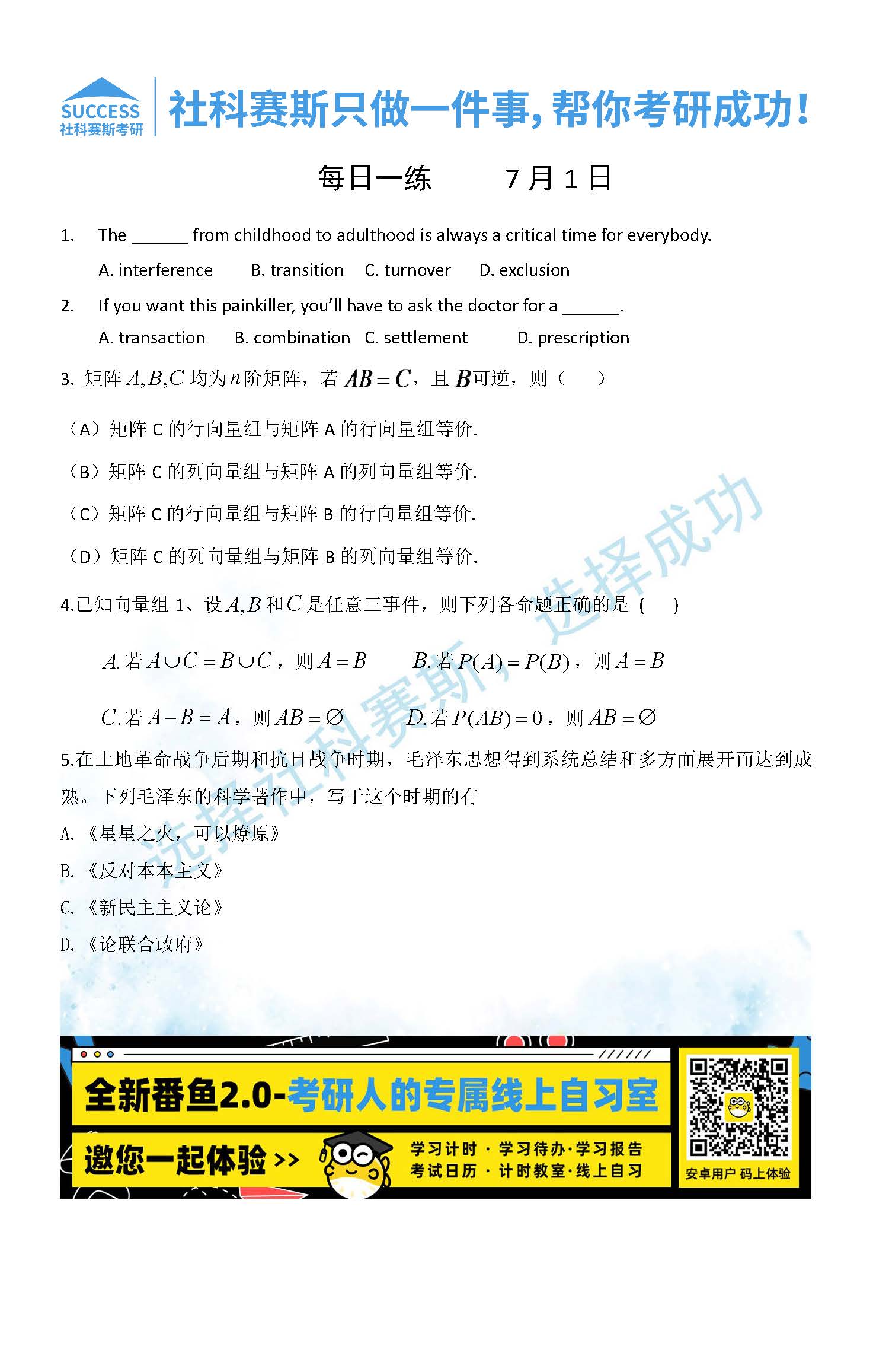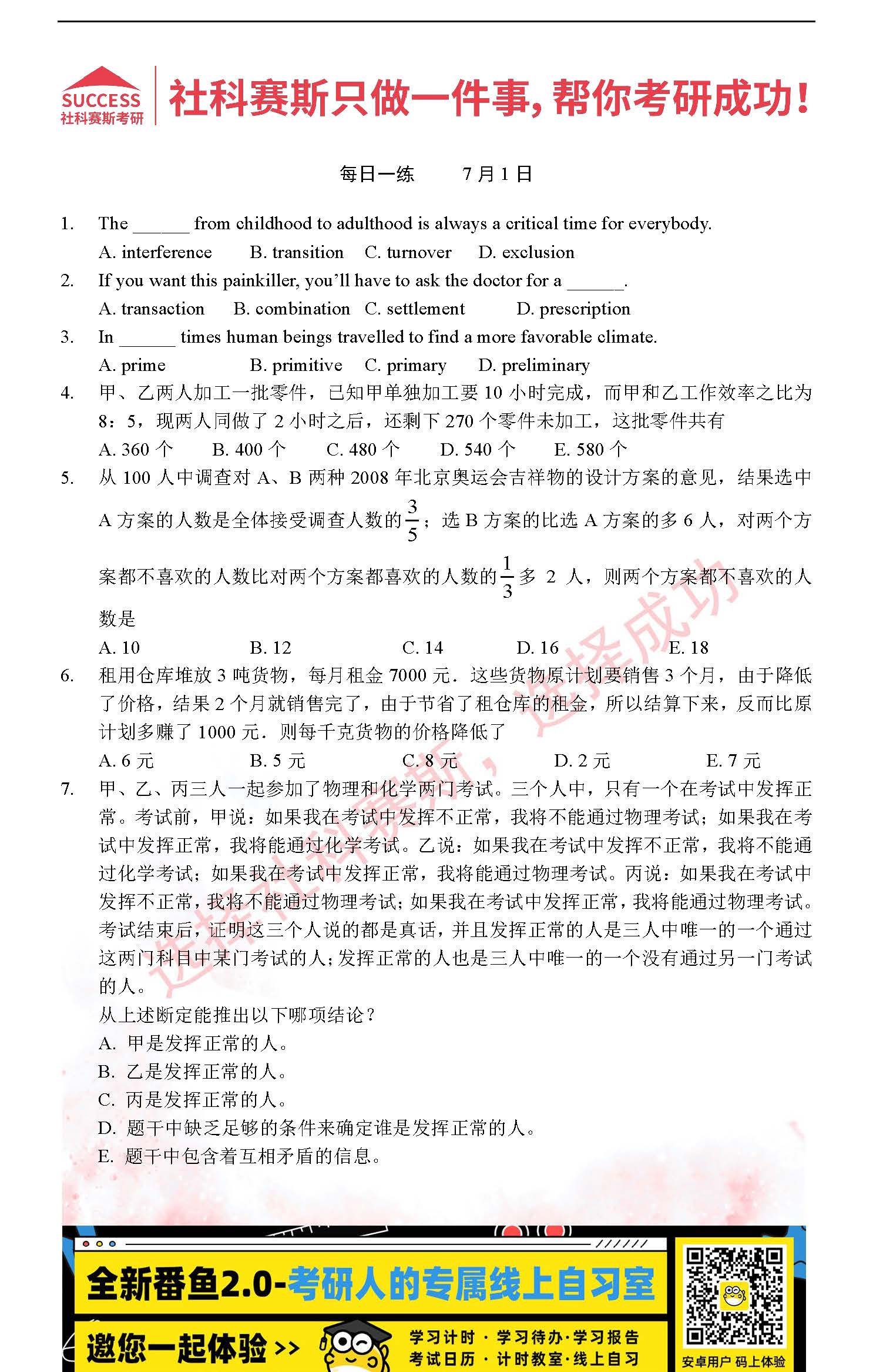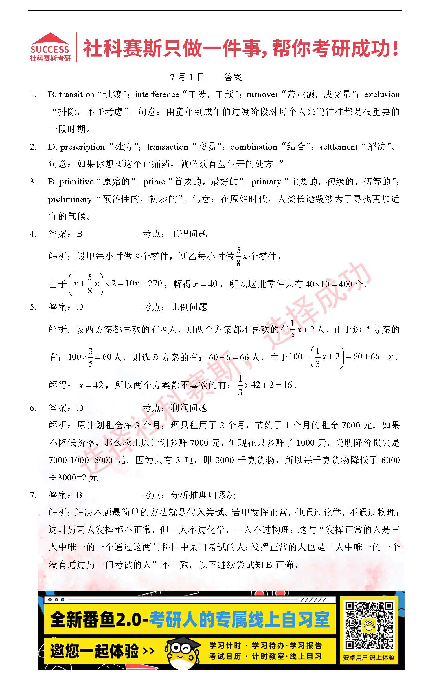 以上就是社科賽斯MBA備考網小編為大家整理“2022管理類聯考7月1日每日一練及答案”的全部內容,希望各位考生堅持利用起來,更多每日一練內容請持續關注MBA備考網管理類聯考每日一練。