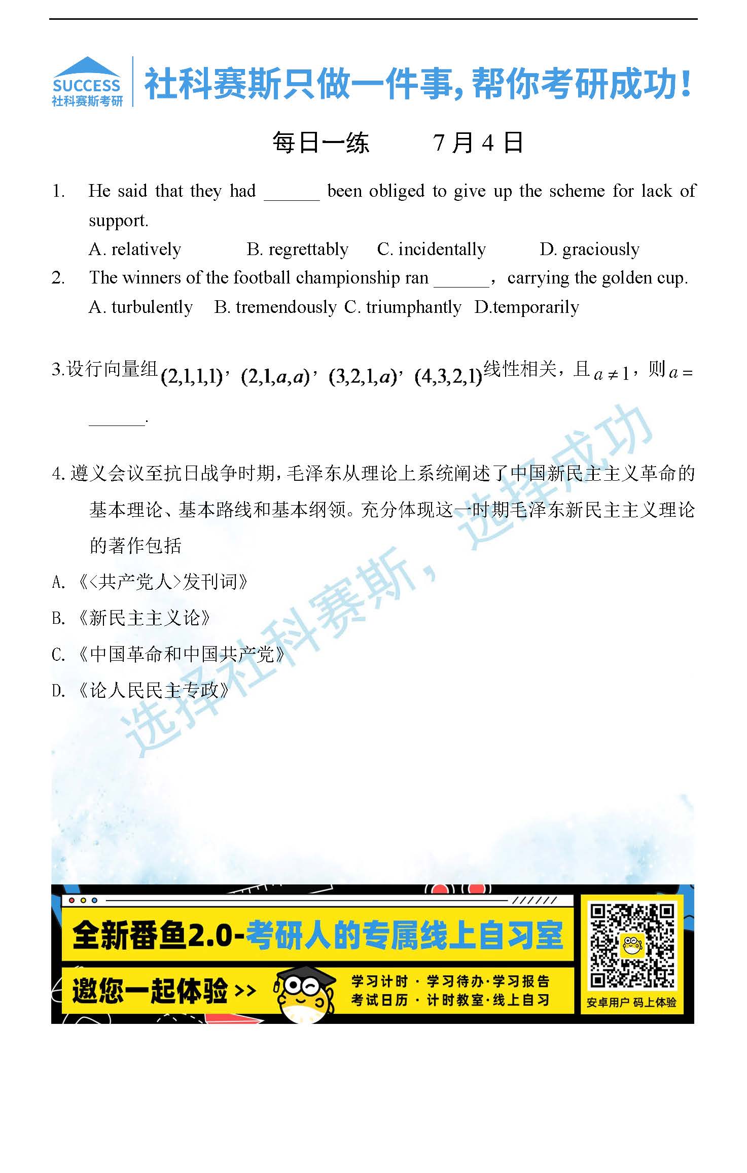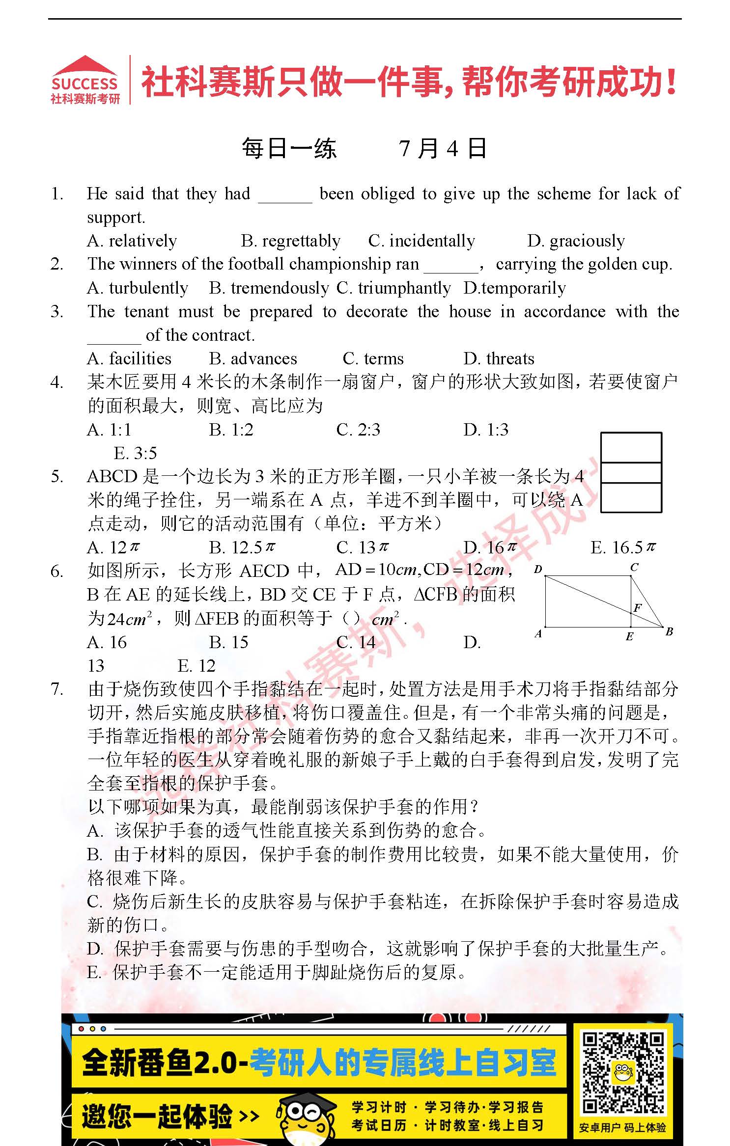 導讀:考研是一場持久戰(zhàn),保持良好的學習習慣,是能確保復習高效的關鍵。今天社科賽斯MBA備考網(wǎng)小編整理了“2022管理類聯(lián)考7月4日每日一練及答案”的內容,希望能對廣大考生有所幫助。