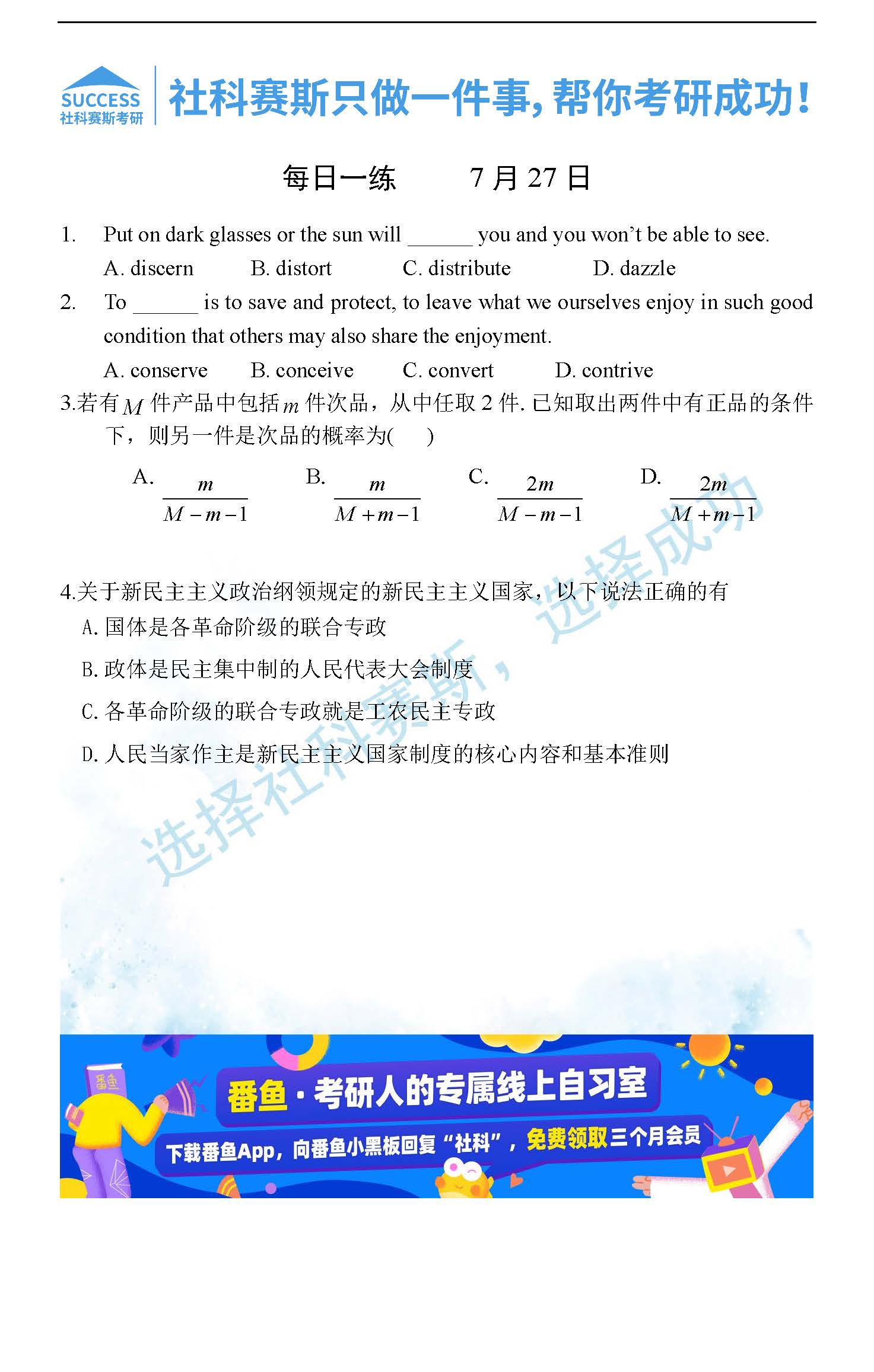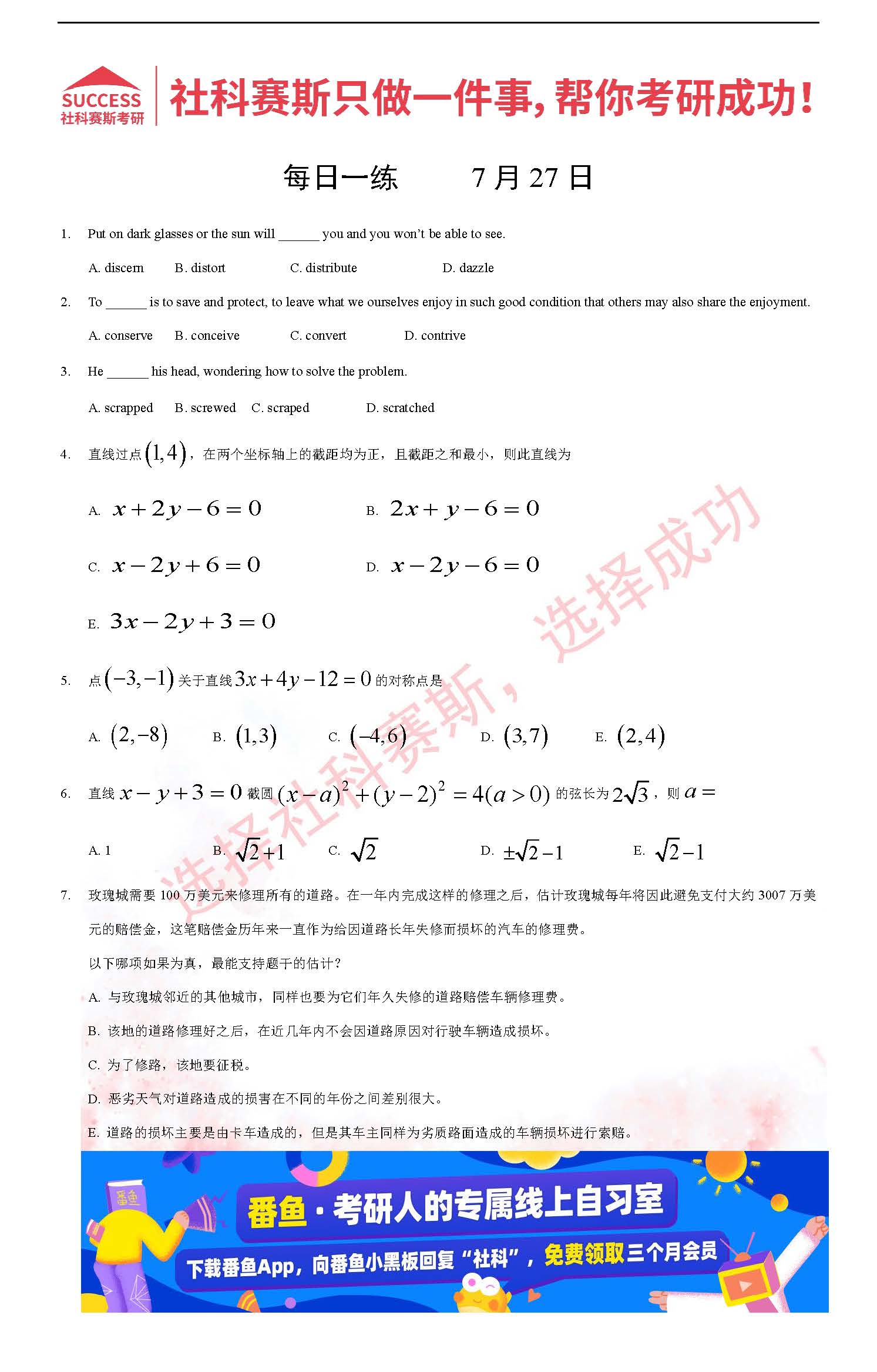導讀:考研是一場持久戰,保持良好的學習習慣,是能確保復習高效的關鍵。今天社科賽斯MBA備考網小編整理了“2022管理類聯考7月27日每日一練及答案”的內容,希望能對廣大考生有所幫助。
