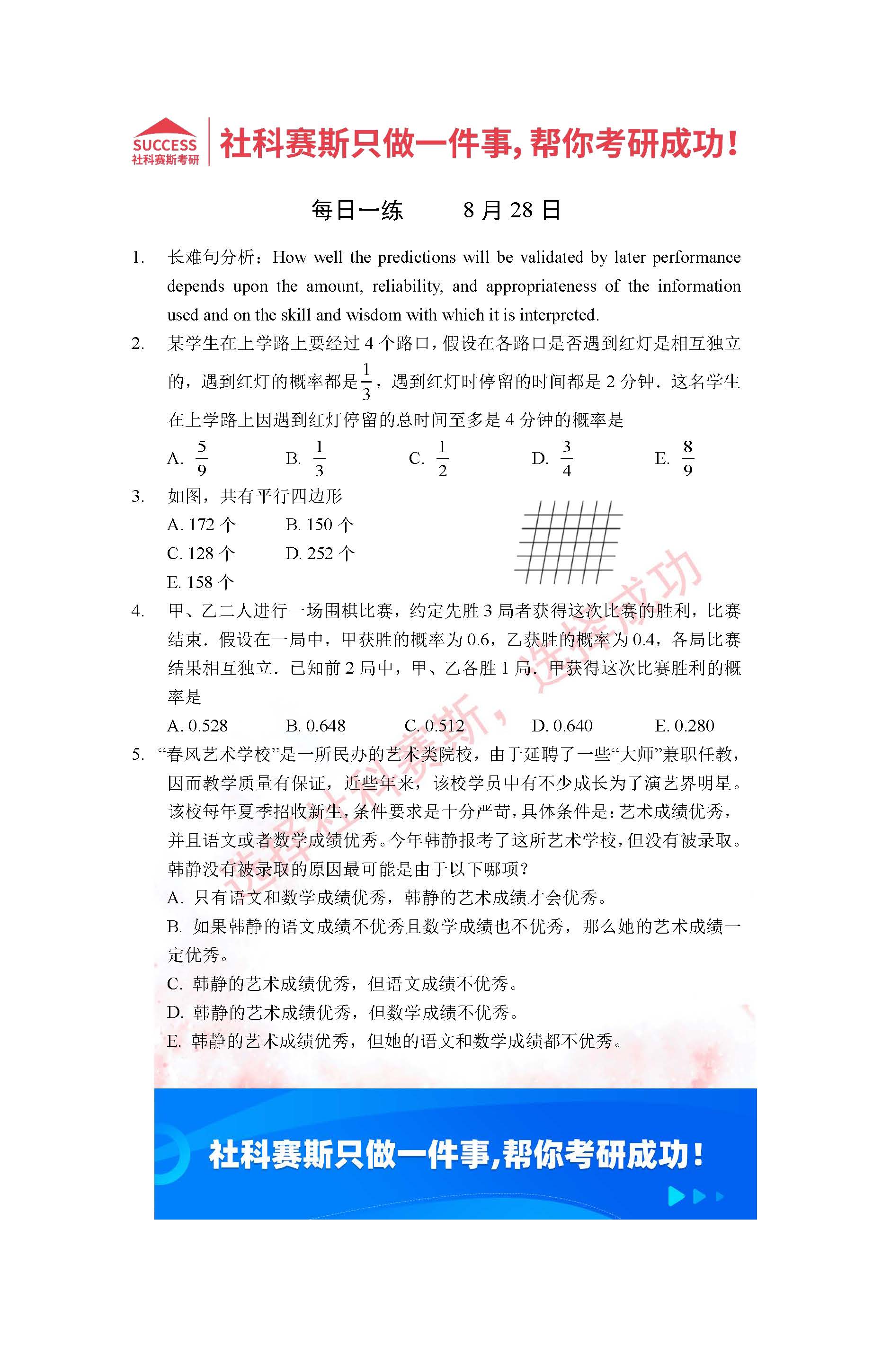 導讀:考研是一場持久戰,保持良好的學習習慣,是能確保復習高效的關鍵。今天社科賽斯MBA備考網小編整理了“2022管理類聯考8月28日每日一練及答案”的內容,希望能對廣大考生有所幫助。