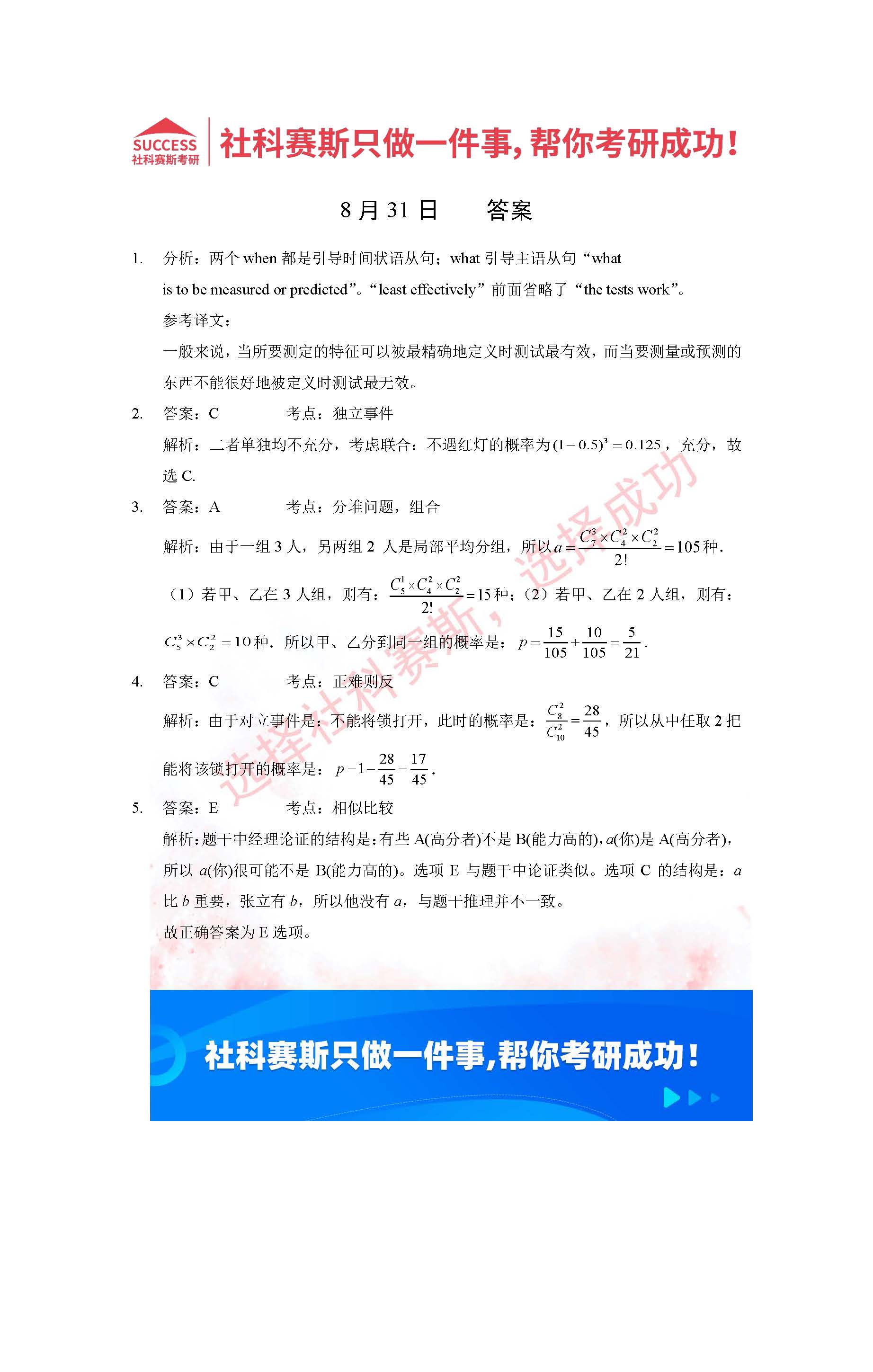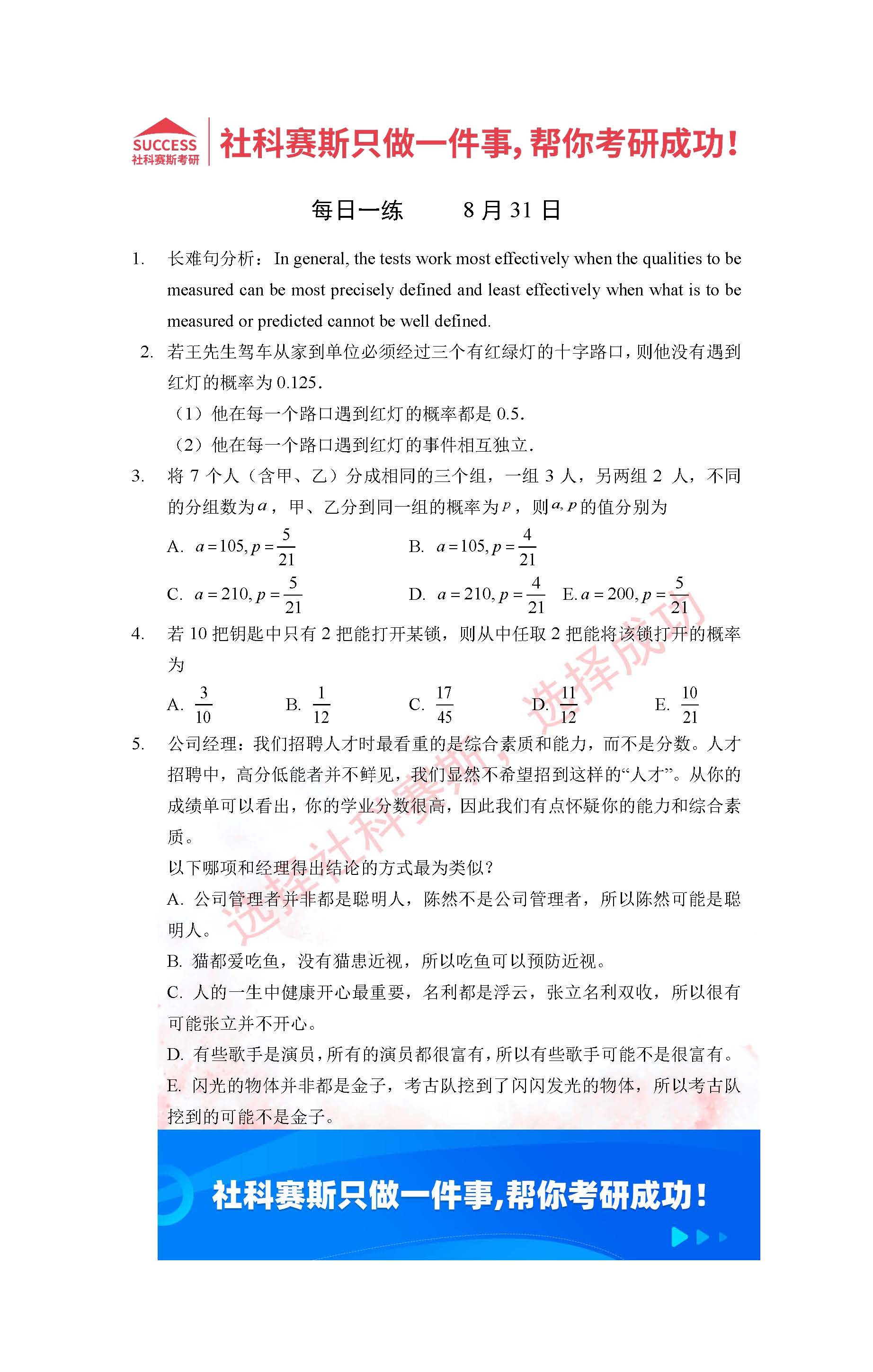 導讀:考研是一場持久戰,保持良好的學習習慣,是能確保復習高效的關鍵。今天社科賽斯MBA備考網小編整理了“2022管理類聯考8月31日每日一練及答案”的內容,希望能對廣大考生有所幫助。