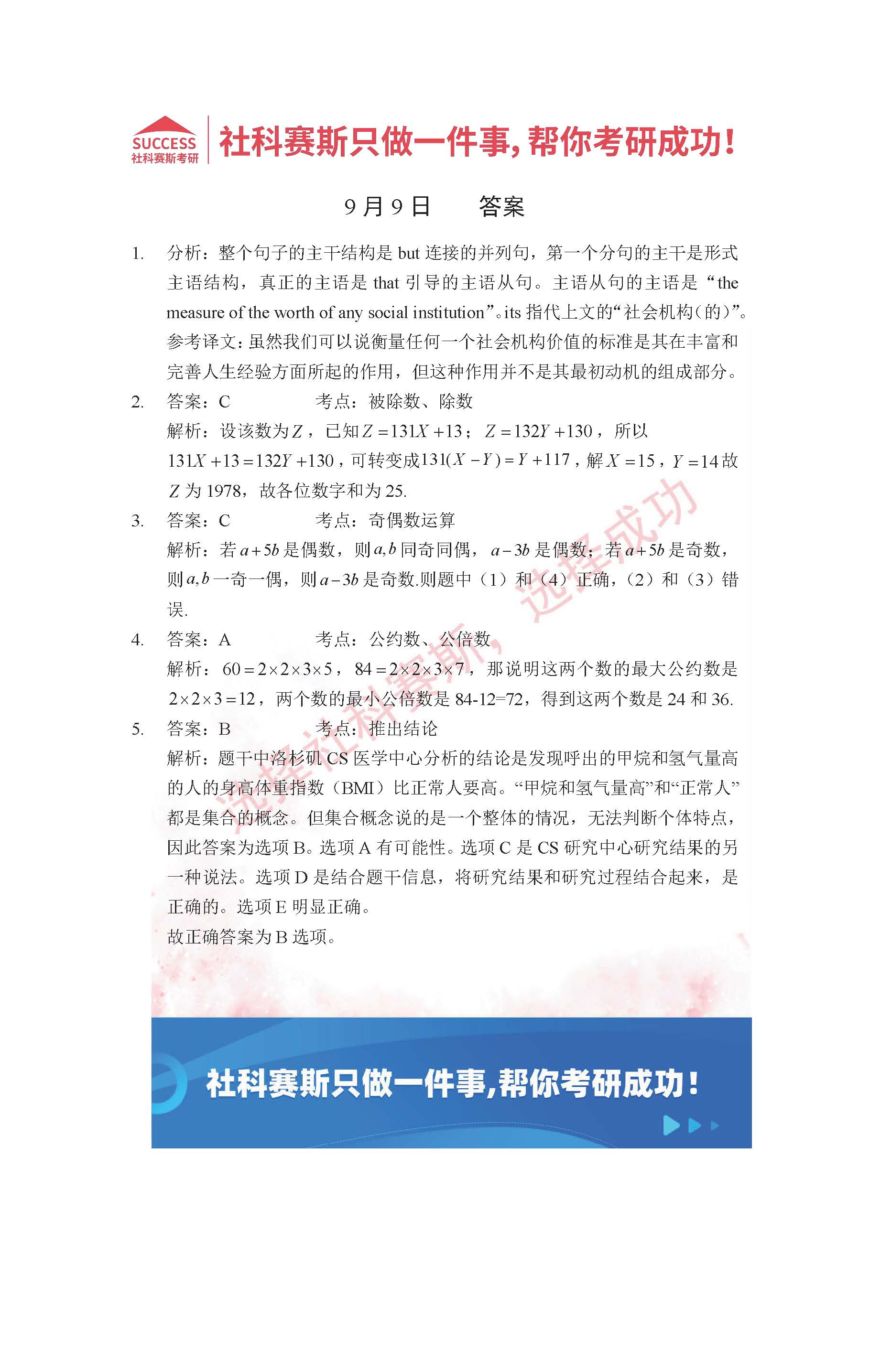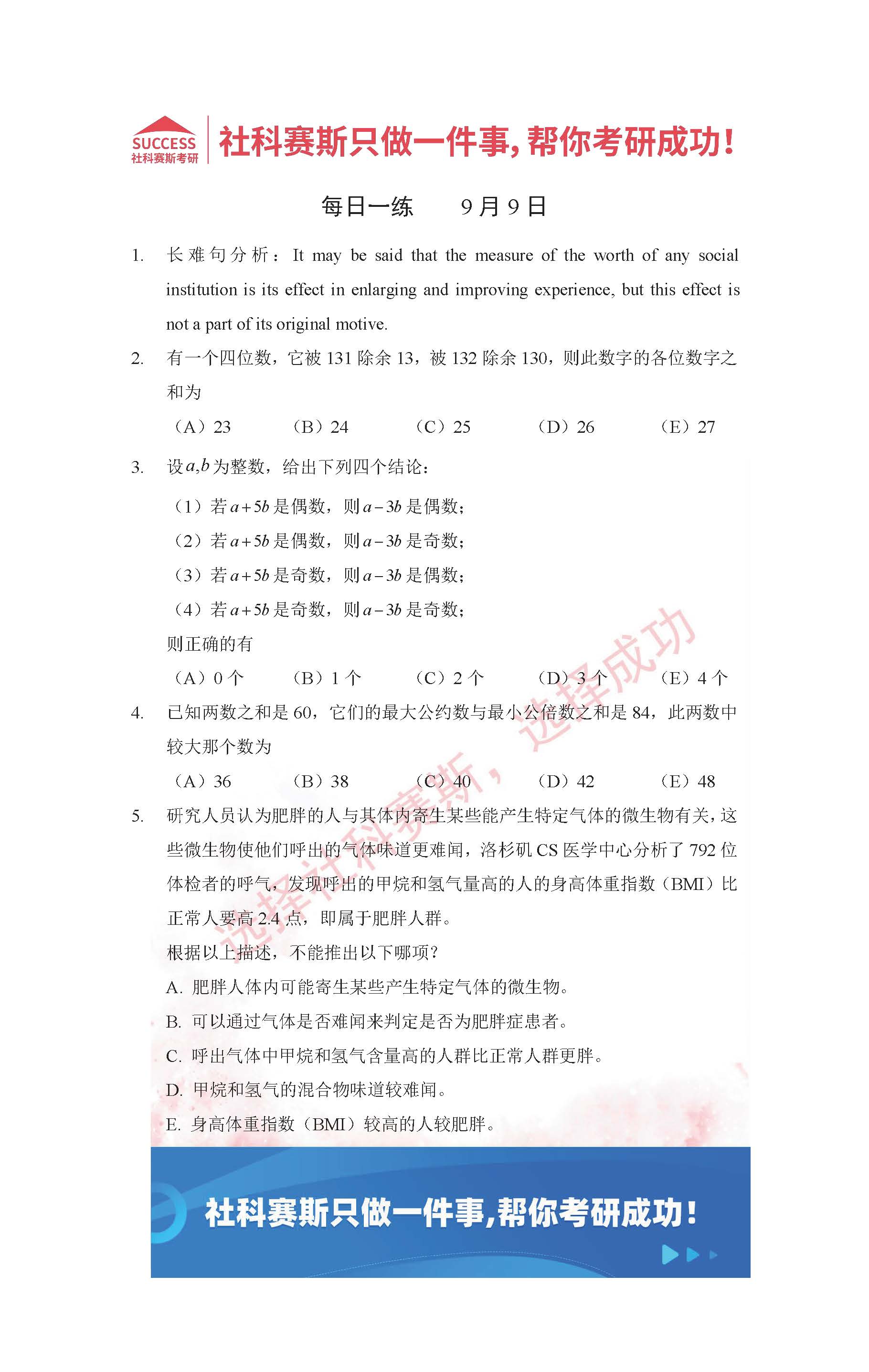 導(dǎo)讀:考研是一場持久戰(zhàn),保持良好的學(xué)習(xí)習(xí)慣,是能確保復(fù)習(xí)高效的關(guān)鍵。今天社科賽斯MBA備考網(wǎng)小編整理了“2022管理類聯(lián)考9月9日每日一練及答案”的內(nèi)容,希望能對廣大考生有所幫助。
