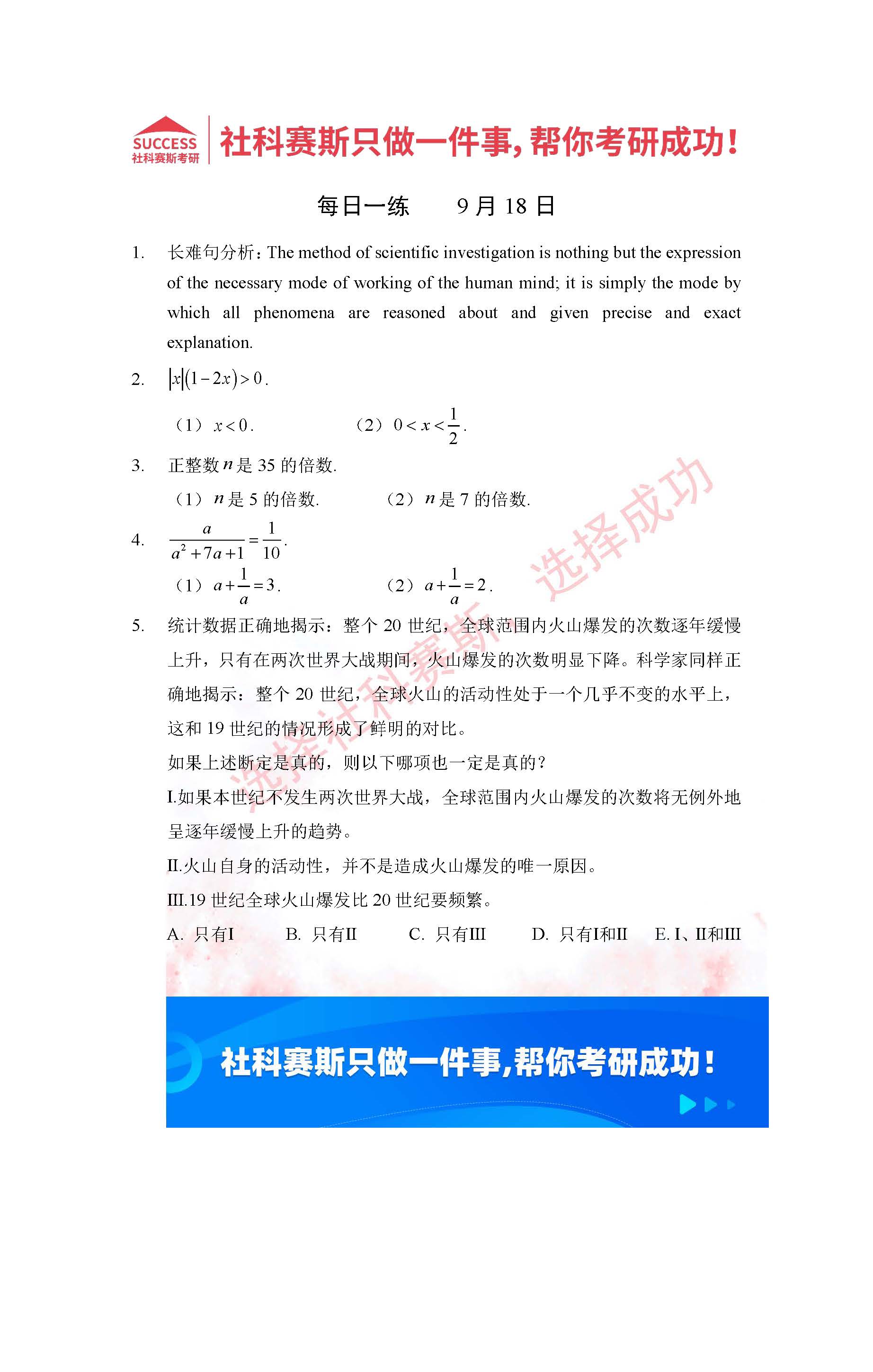 導(dǎo)讀:考研是一場(chǎng)持久戰(zhàn),保持良好的學(xué)習(xí)習(xí)慣,是能確保復(fù)習(xí)高效的關(guān)鍵。今天社科賽斯MBA備考網(wǎng)小編整理了“2022管理類聯(lián)考9月18日每日一練及答案”的內(nèi)容,希望能對(duì)廣大考生有所幫助。