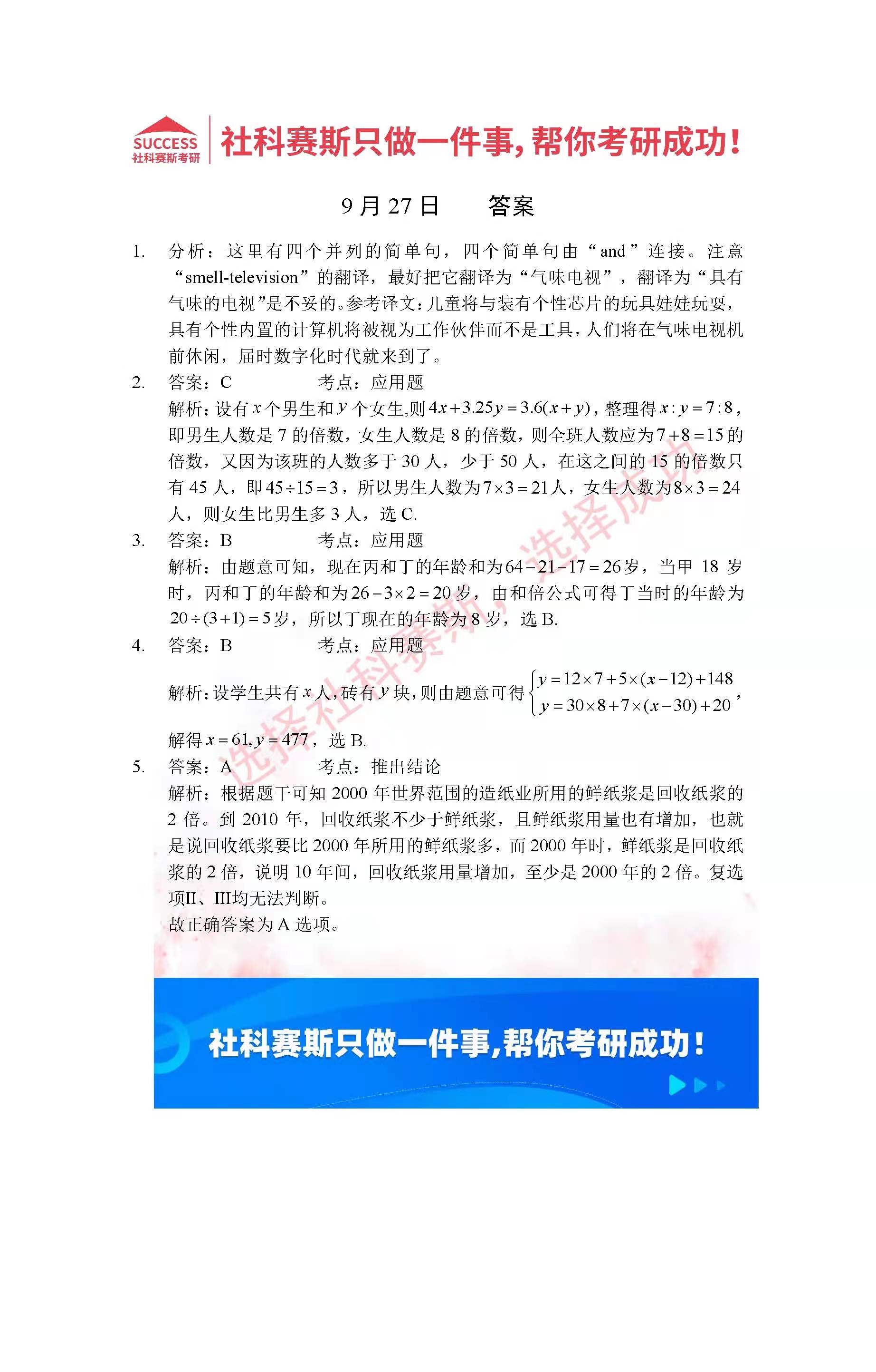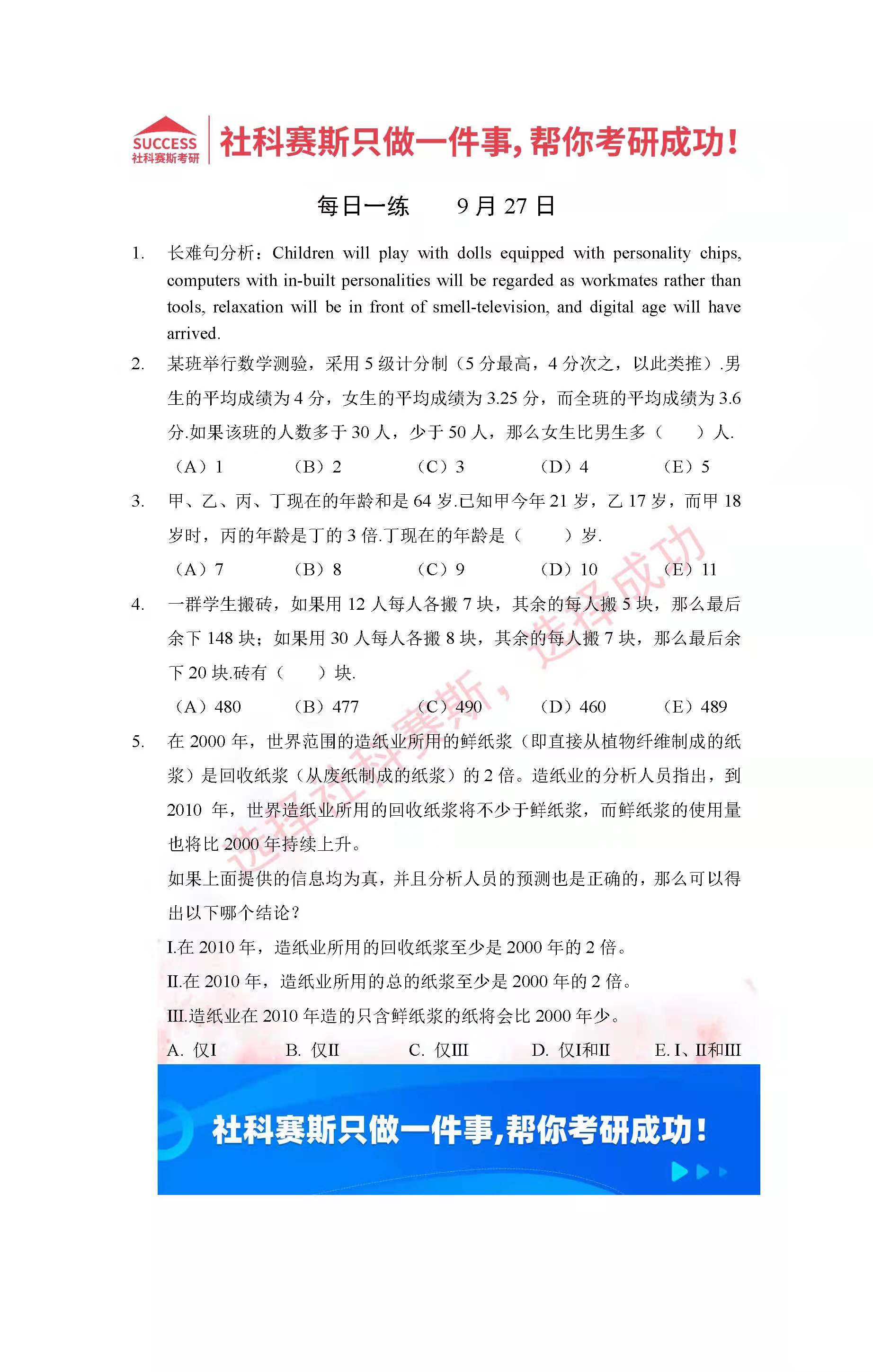 以上就是社科賽斯MBA備考網小編為大家整理2022管理類聯考9月27日每日一練及答案的全部內容,希望各位考生堅持利用起來,更多每日一練內容請持續關注MBA備考網管理類聯考每日一練。