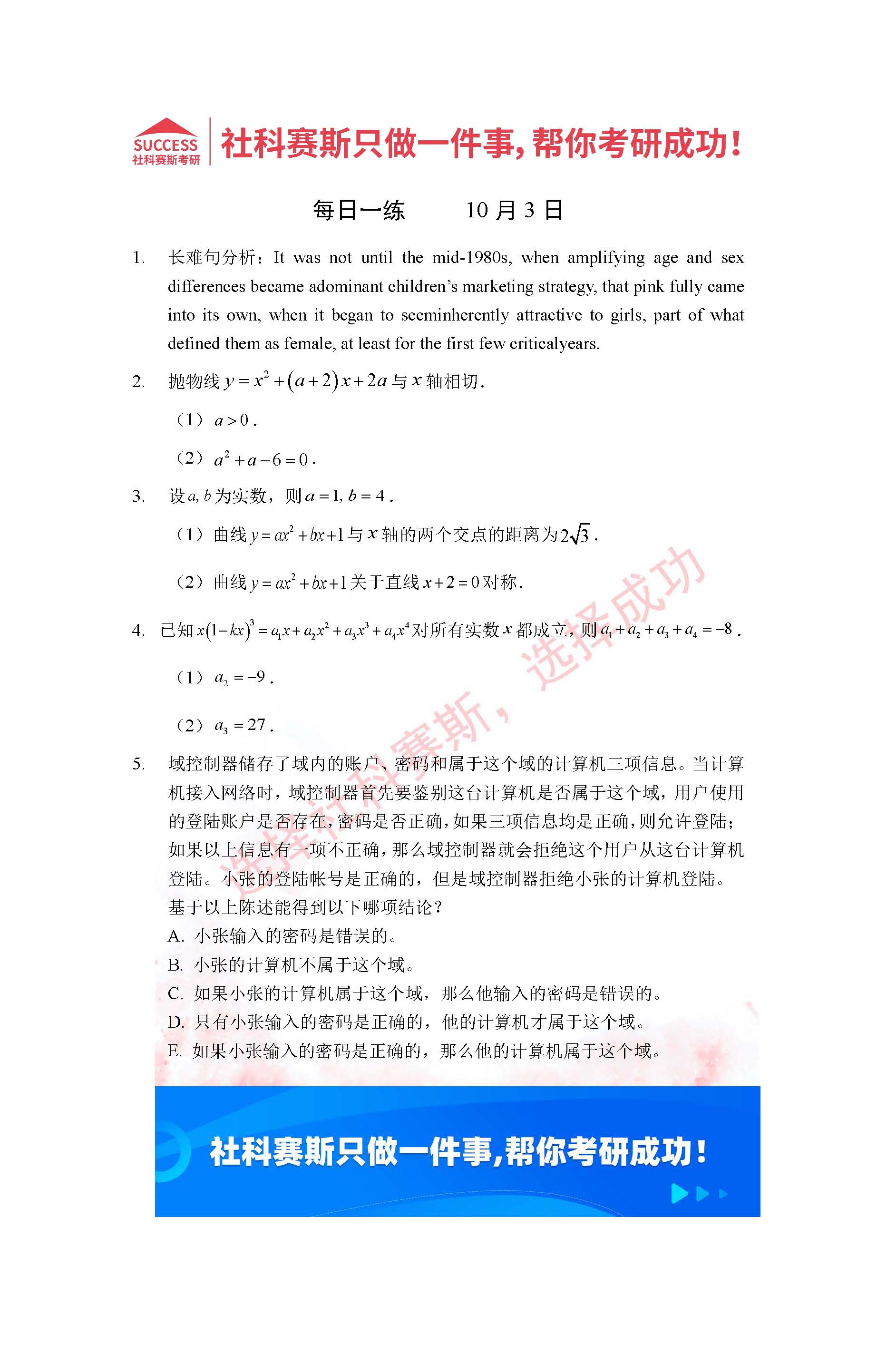 導讀:考研是一場持久戰,保持良好的學習習慣,是能確保復習高效的關鍵。今天社科賽斯MBA備考網小編整理了“2022管理類聯考10月3日每日一練及答案”的內容,希望能對廣大考生有所幫助。